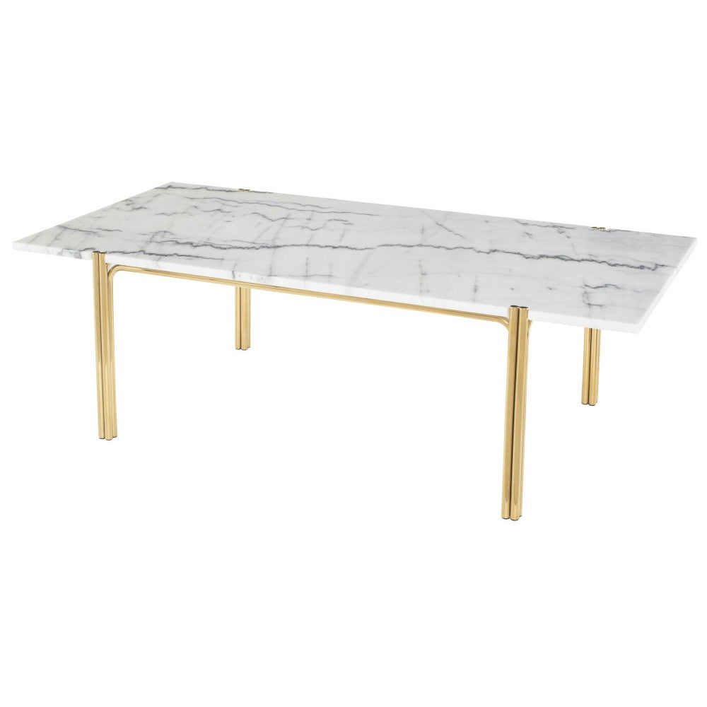 The Sussur coffee table presents a refined aesthetic. A textured marble top, rests on elegantly crafted doubled legs of polished gold. The design projects a warm graceful formality. Each piece of marble is expertly crafted out of a unique piece of natural stone, creating beautiful variations and one-of-a-kind details.