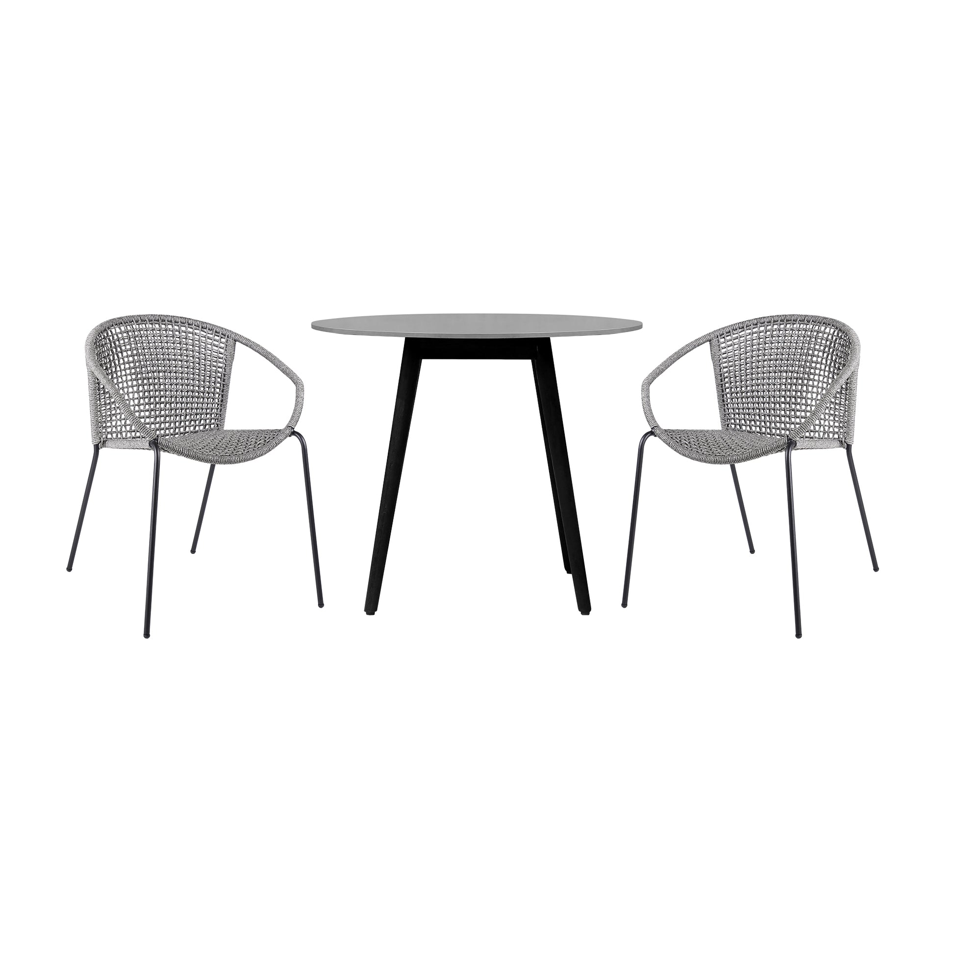 The Sydney and Snack 3 Piece Outdoor Patio Dining Set from Armen Living is a perfect addition to any outdoor space! The mixed materials work well together and create a fun and cohesive dining set for your front porch, back yard, pool side space, or patio. Constructed from eucalyptus wood and a grey super stone top, the 36-inch round dining table is a modern addition that easily fits into any space. This patio dining table features sleek tapered wood legs that allow for ample leg room. One of the best reasons to choose Eucalyptus wood for your outdoor furniture or four-seasons porch is that it is exceptionally resistant to decay and rot. It naturally resists the influence of moisture because of the high oil content it naturally contains. That means it can get damp without you worrying about whether damage will occur. It can withstand several different outdoor elements while lasting for many years if it receives proper care. Defined by functional simplicity and timeless beauty, the dining table delivers a harmony of natural textures to complement any outdoor space. The stone top features a 5-layer composite with 2 layers of cement fiberboard surrounding the aluminum honeycomb core. This beautiful tabletop is durable and robust - capable of withstanding inclement weather and everyday wear and tear. Featuring an elaborate woven design and durable metal frame, the snack dining chairs will blend seamlessly into your outdoor decor. The wide seat and back offer ample room for seating - creating a divine seating experience. These outdoor chairs feature a weather-resistant regatta cording tightly crosshatches the entire seat and back, providing supportive comfort so you enjoy time around the table with loved ones - also enhancing your seating experience with a softness that rivals most fabrics. Each chair is made with the best craftsmanship, with these chairs standing on top of durable metal legs in a black finish for a modern look.