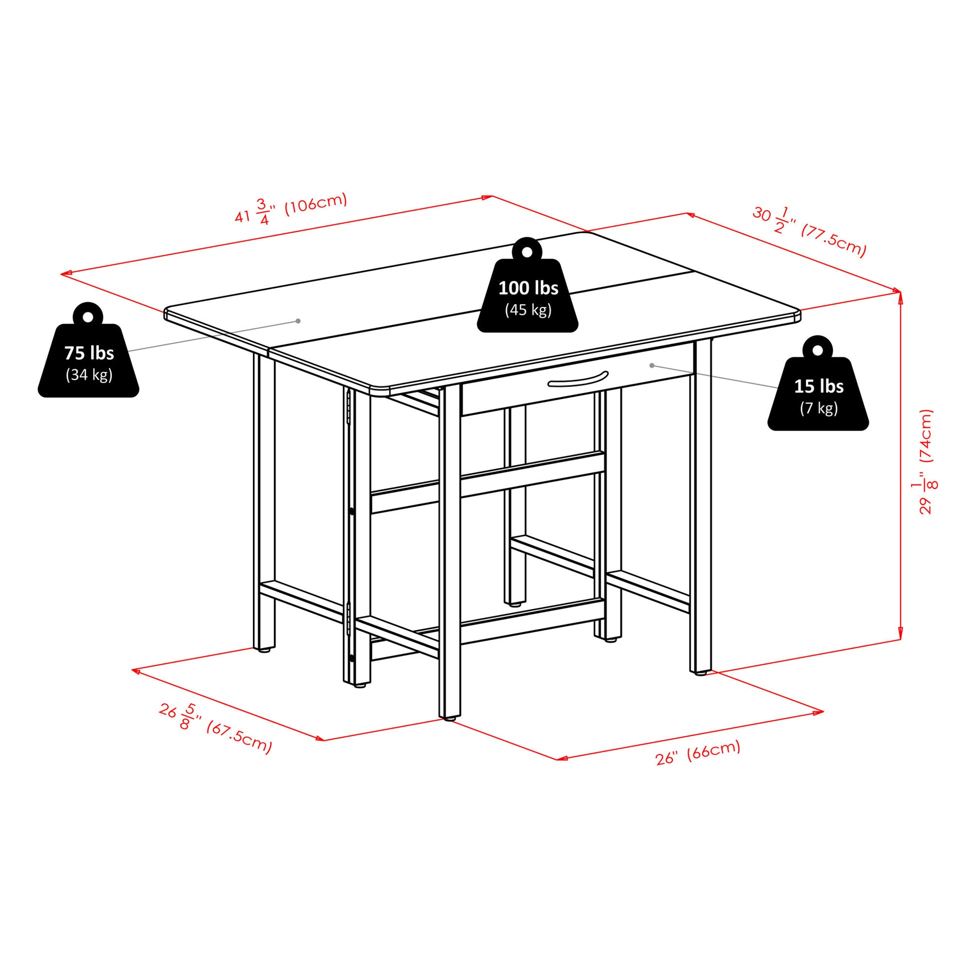 This 5-piece Taylor Drop Leaf Table Set features an elegantly simple and versatile table with four handsome solid wood folding chairs. With the drop leaf extended, the table is doubled in size and is perfect for dining in the kitchen or breakfast nook. Use the table as a console with the drop leaf down. Or make the set an ideal addition to the family room to spread out games or a puzzle. The table-wide drawer provides storage for silverware, placemats, games, or personal electronic devices. The table top and frame are made of solid wood for long lasting durability. Overall size with drop leaf extended 41.7"W x 30.5"D x 29"H.