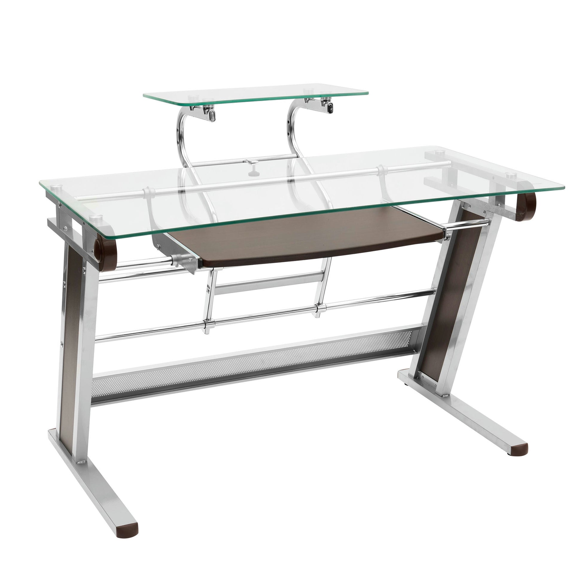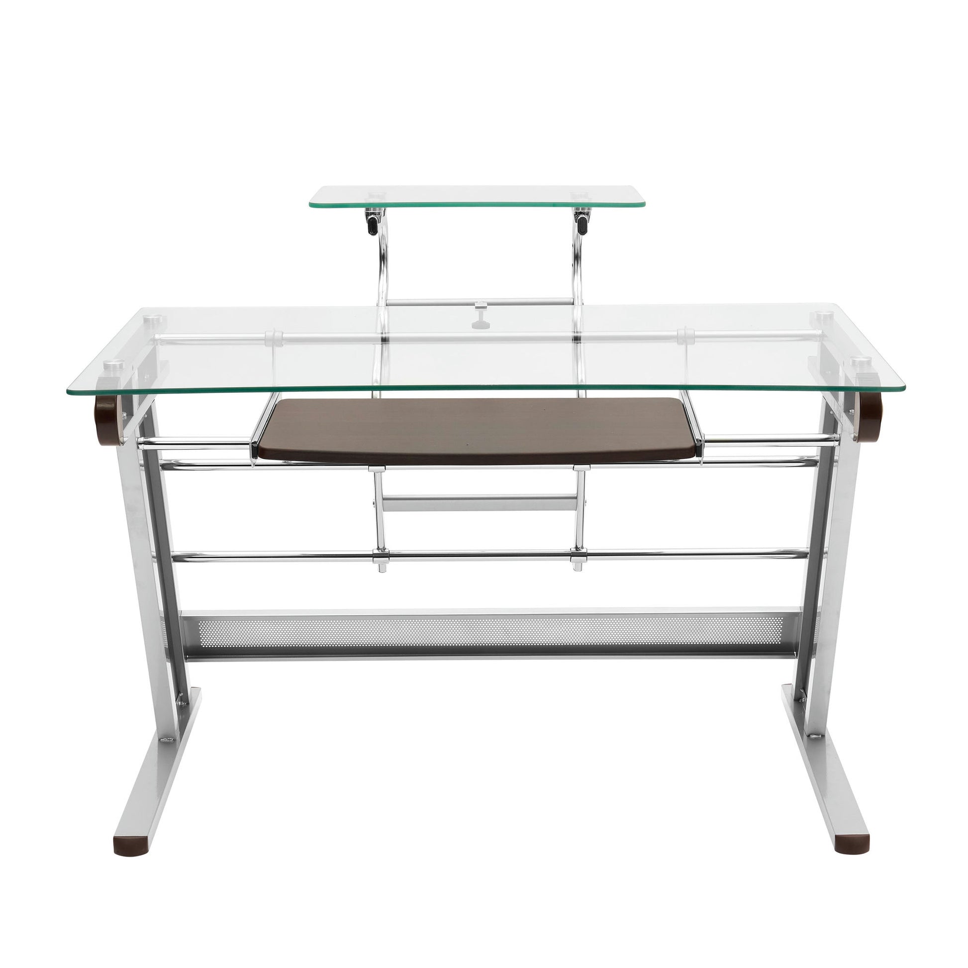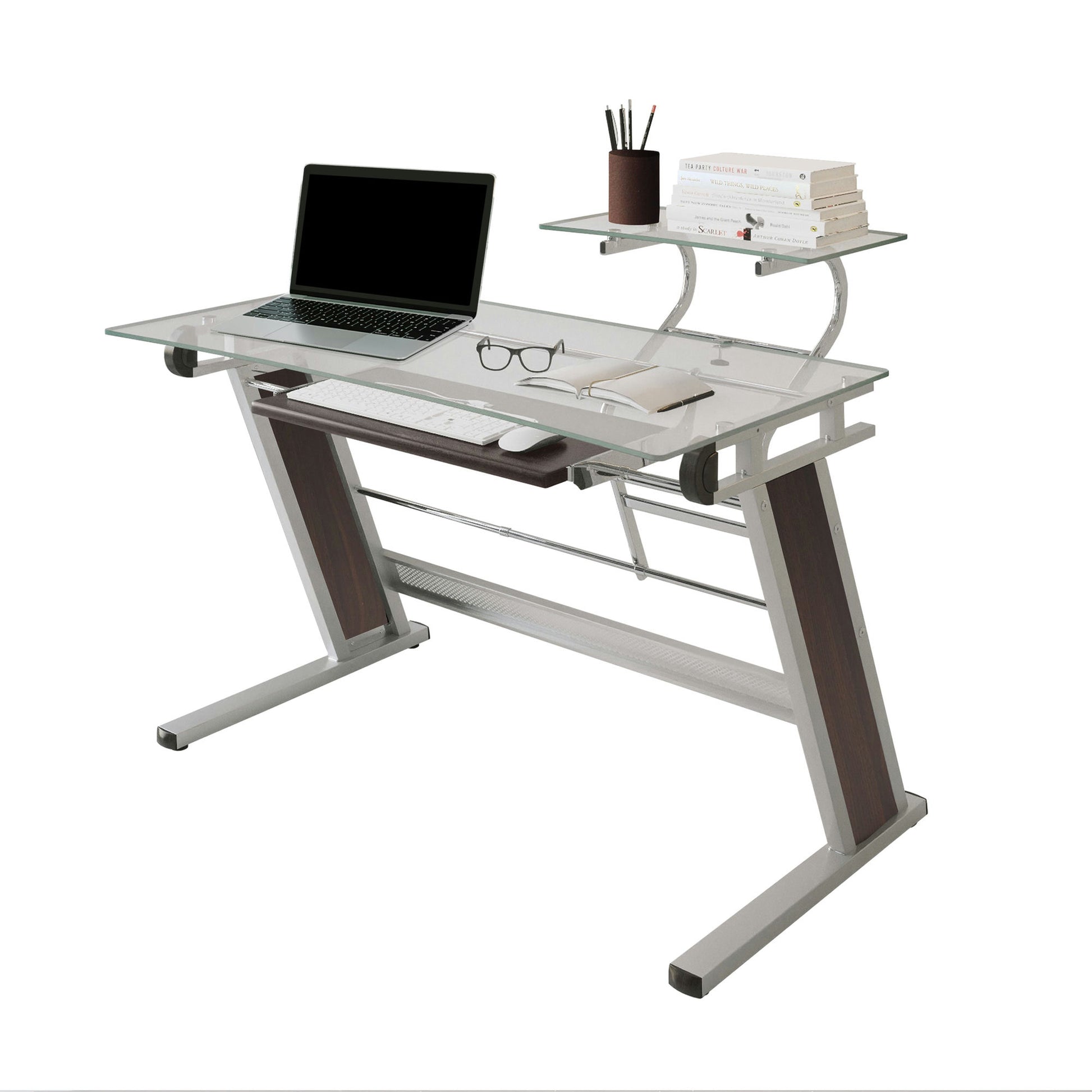 Accentuate your home-office space with this glass computer desk. The powder-coated steel frame offers strength and stability, while the tempered glass work surface provides ample space for everyday work essentials. It features a sliding adjustable printer/accessory shelf and pullout keyboard tray that slides left to right for an optimal working position. Its unique Z-shape frame offers wider leg space — substantially optimizing the comfort and aesthetics