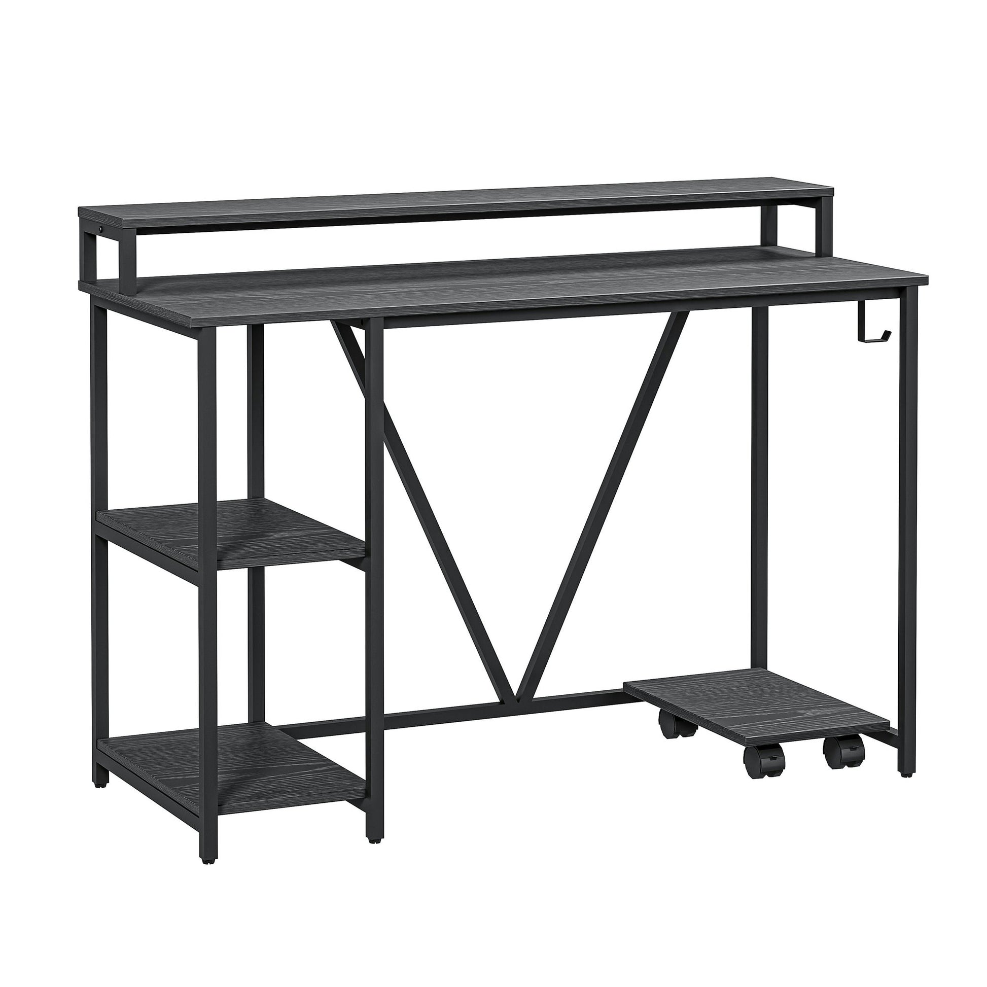 This writing desk features a clean-lined silhouette with a two-tier side open shelf plus an elevated hutch-like shelf giving your home office a modern industrial look. The engineered wood surfaces showcase a rich black wood grain hue with sturdy steel frame that brings some industrial vibes to your workspace. It includes a powder-coated steel frame adding plenty of support, plus a small side holder hook to hang your headphones , or any other accessories. It also includes a convenient mobile CPU Caddy to elevate your CPU box off the floor.