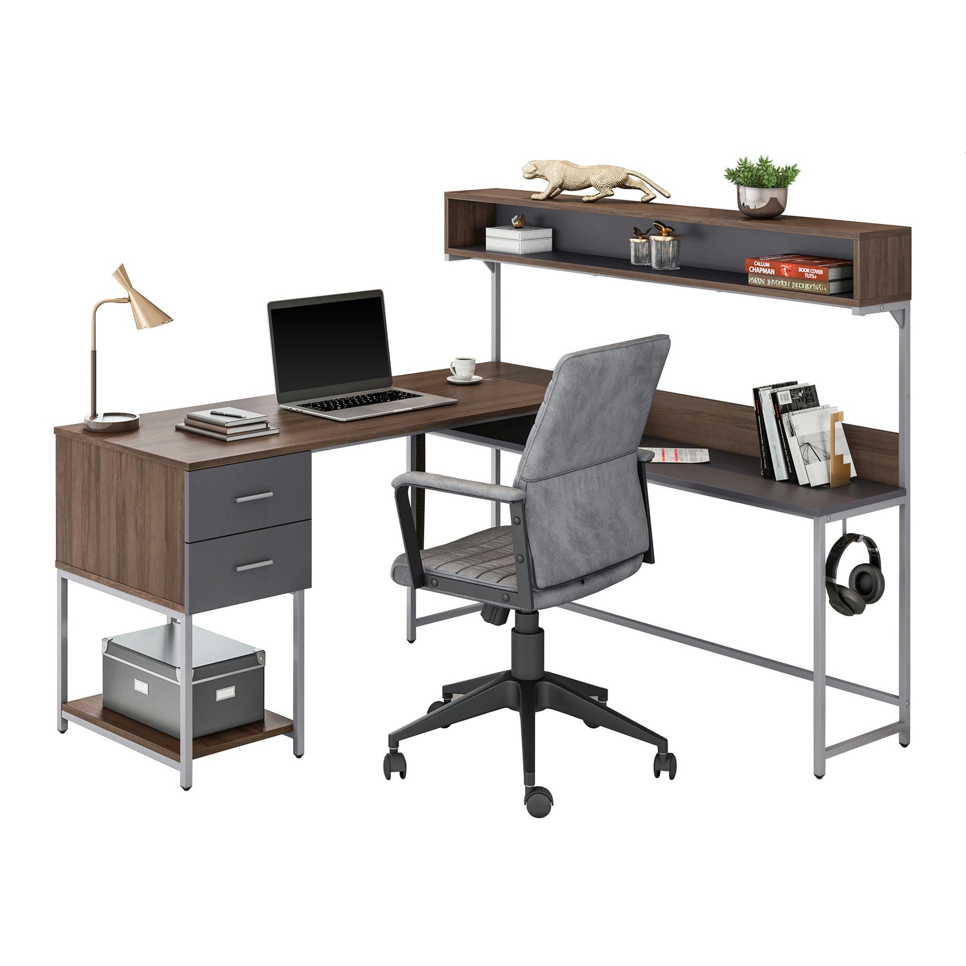 Transform your work area with this large industrial-style L-shaped workstation with hutch that combines a spacious desktop with under-desk shelf and storage. The engineered wood finish in vintage walnut and powder-coated steel frame ensures stability and durability. The extra side shelf, two drawers, and upper storage compartments on the hutch provide ample space for storing books or documents or displaying decorative items. Maximize your workspace with this versatile and stylish L-shape computer desk, which is sure to make a statement in any home-office setting.