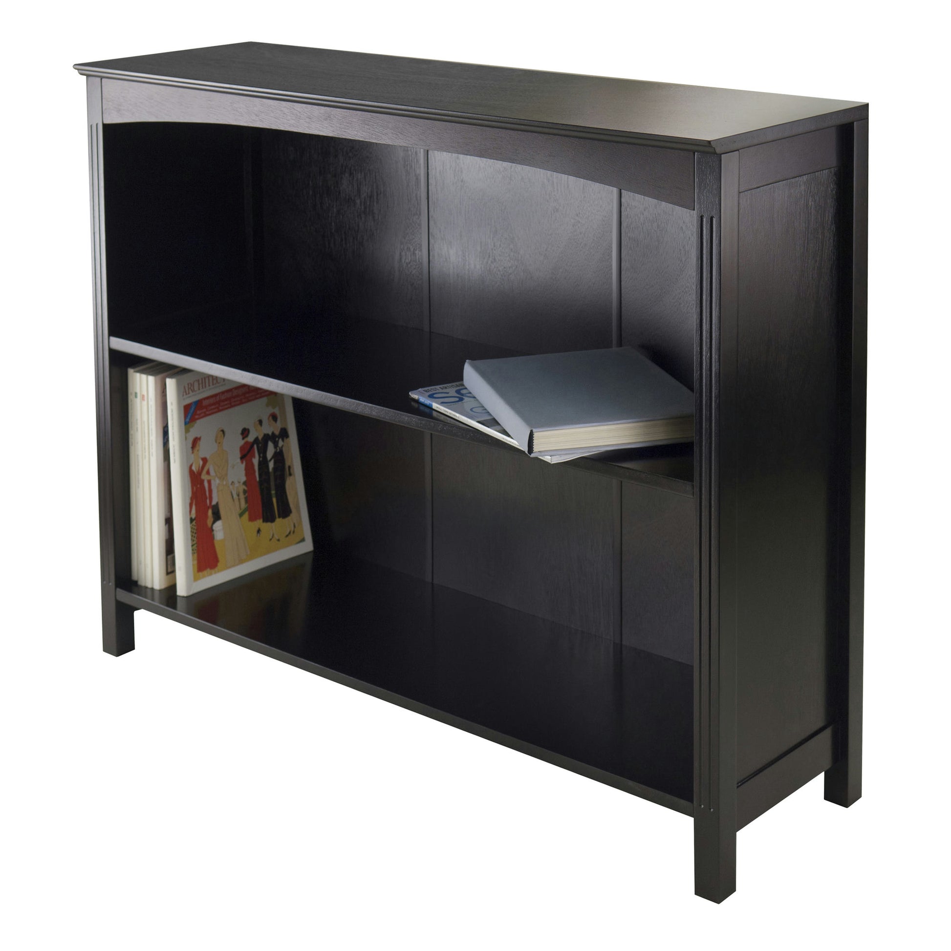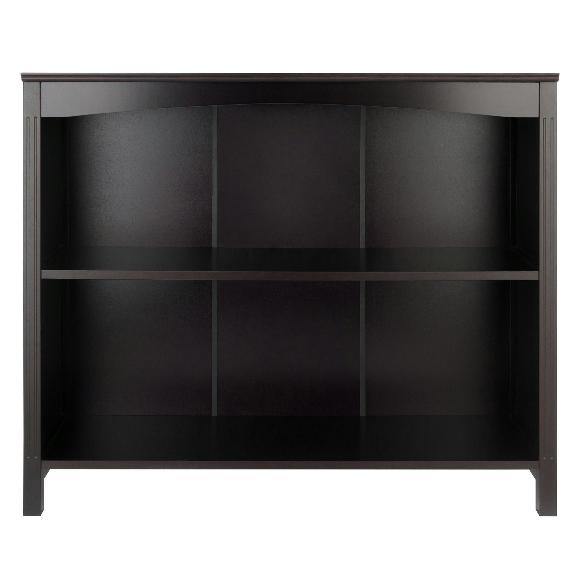 A gently curved apron and grooved front legs add a subtle, yet distinctive touch to the Terrace 2-Section Wide Bookcase. Perfect for keeping books and/or displaying collectibles, use it in the living room or home office. Made of solid and composite wood in a rich espresso finish.