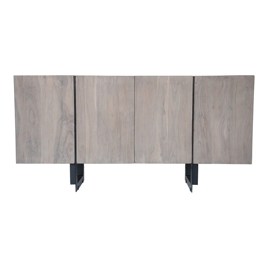 A contemporary, industrial sideboard with a pale-grey finish. Tons of storage to help keep your dining or living room neat and tidy. Crafted from solid wood and black, powder-coated iron for top-notch quality.