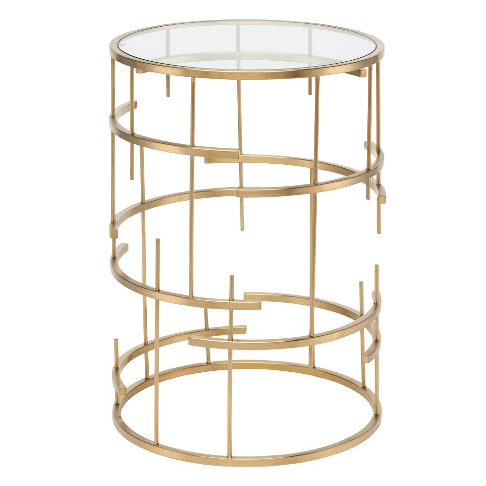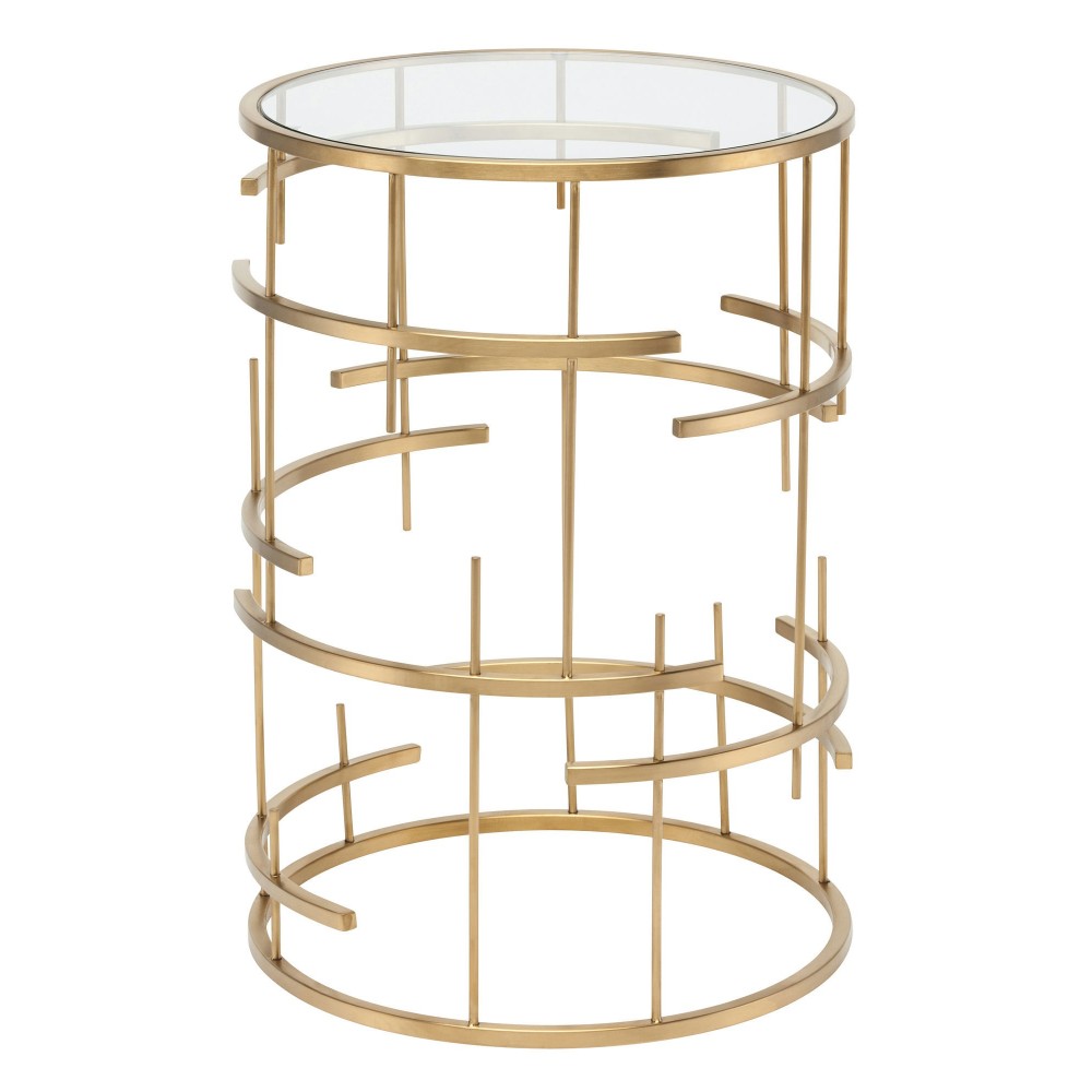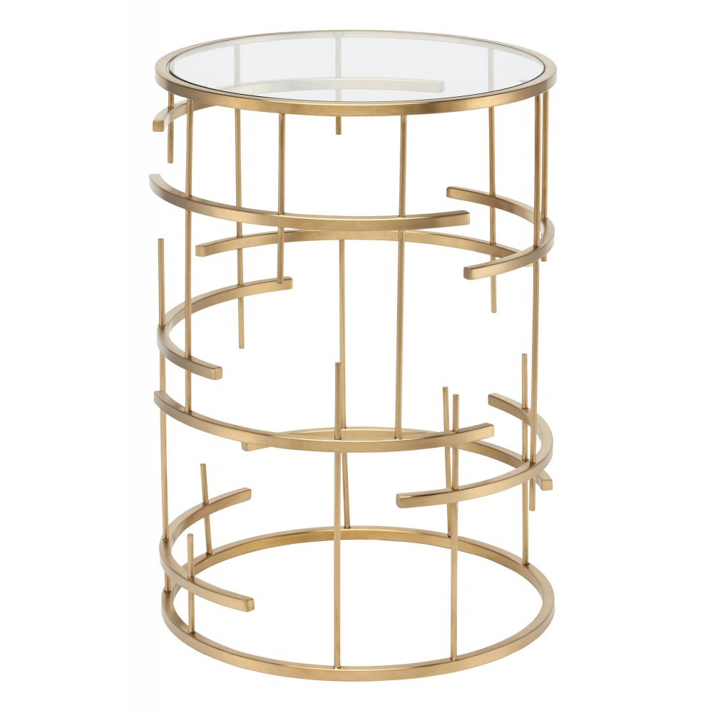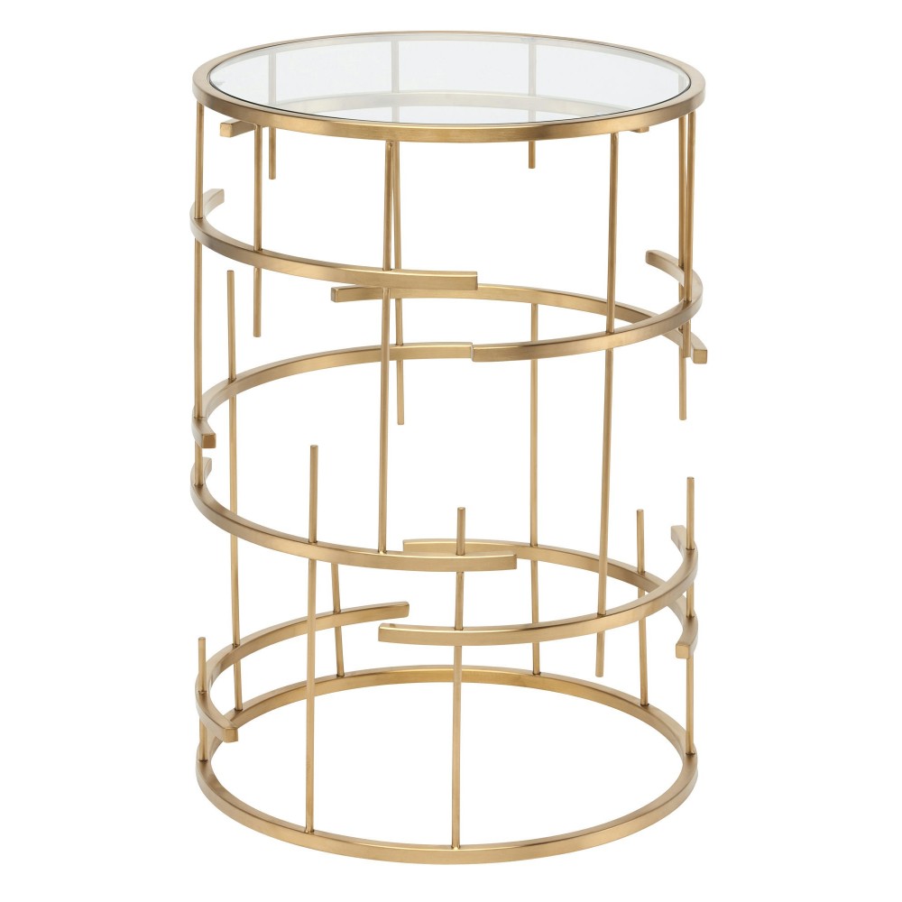 The delicate cross-hatching of the Tiffany side table finds its roots in the early modernism of the art deco era. A delicate geometric play of horizontal and vertical bars arranged in a curved pattern creates a light, open harmonious stainlesss steel frame heightened by an elegant 1/2 inch clear glass top.