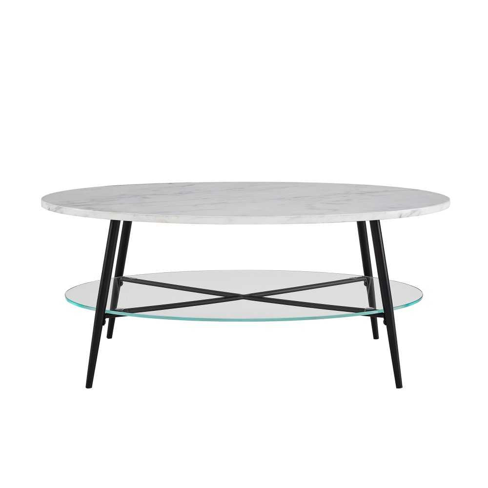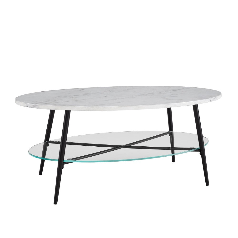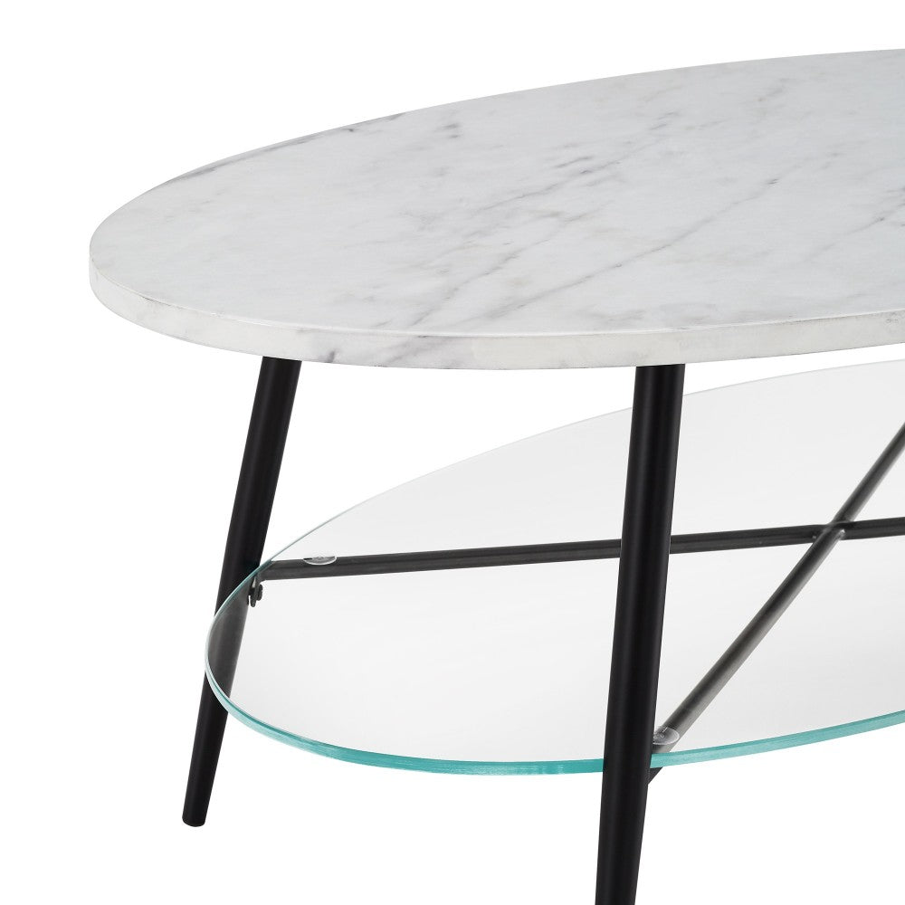 Add a sophisticated touch to your living room or den with this modern glam coffee table. The mix of faux marble and tempered safety glass shelves provide a mature aesthetic to brighten your home. Your guests will compliment the contemporary frame completed with angled metal legs and an oval shape. The tabletop finish looks even more realistic with the water-resistant, high-gloss UV coating. The warp-resistant MDF wood build create a long-lasting piece you can rely on for game nights or cocktail hours.