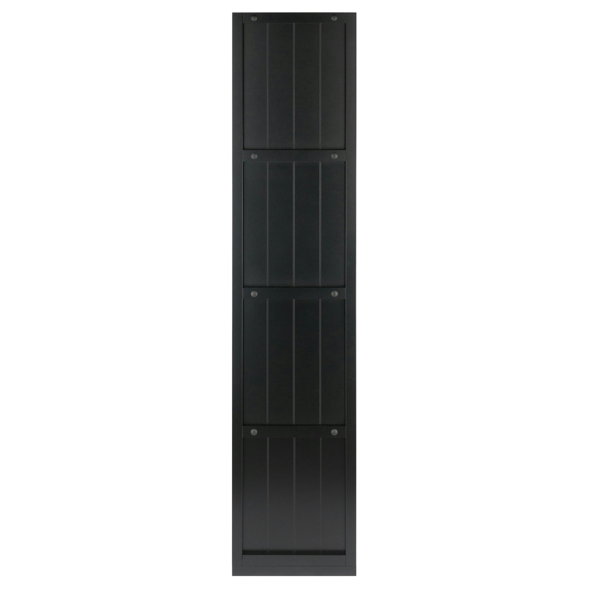 - Black shelf with wainscoting panels, made from composite wood