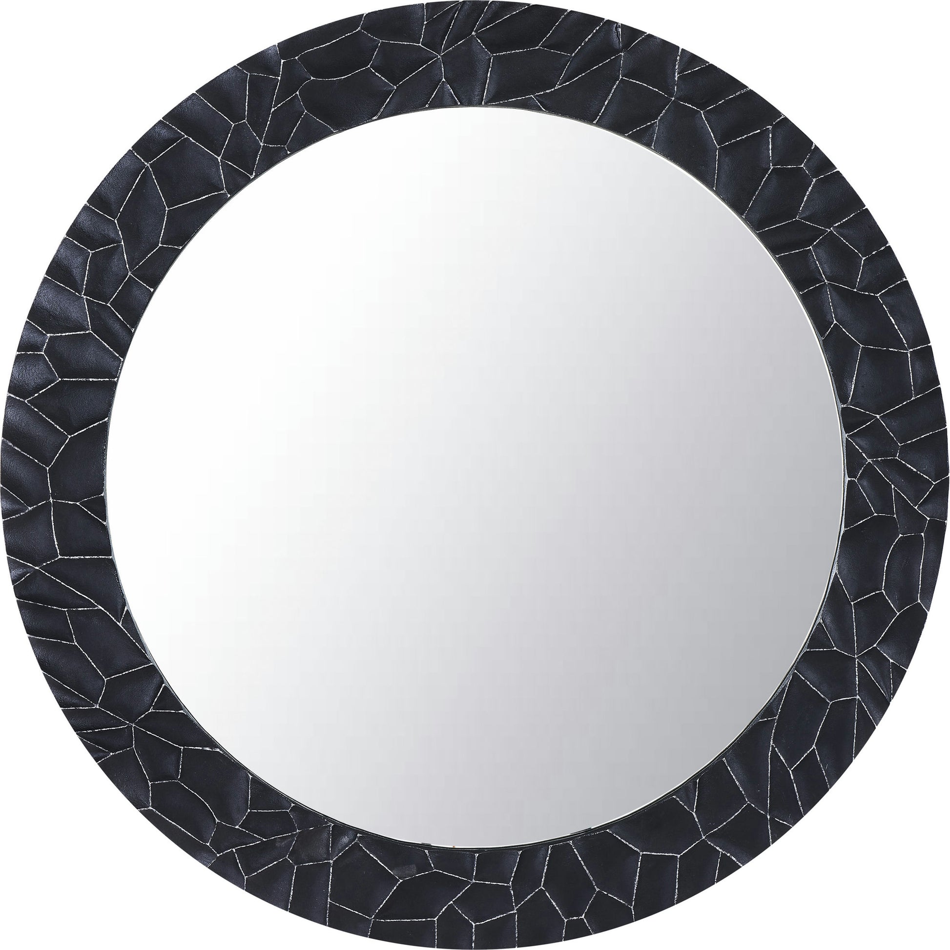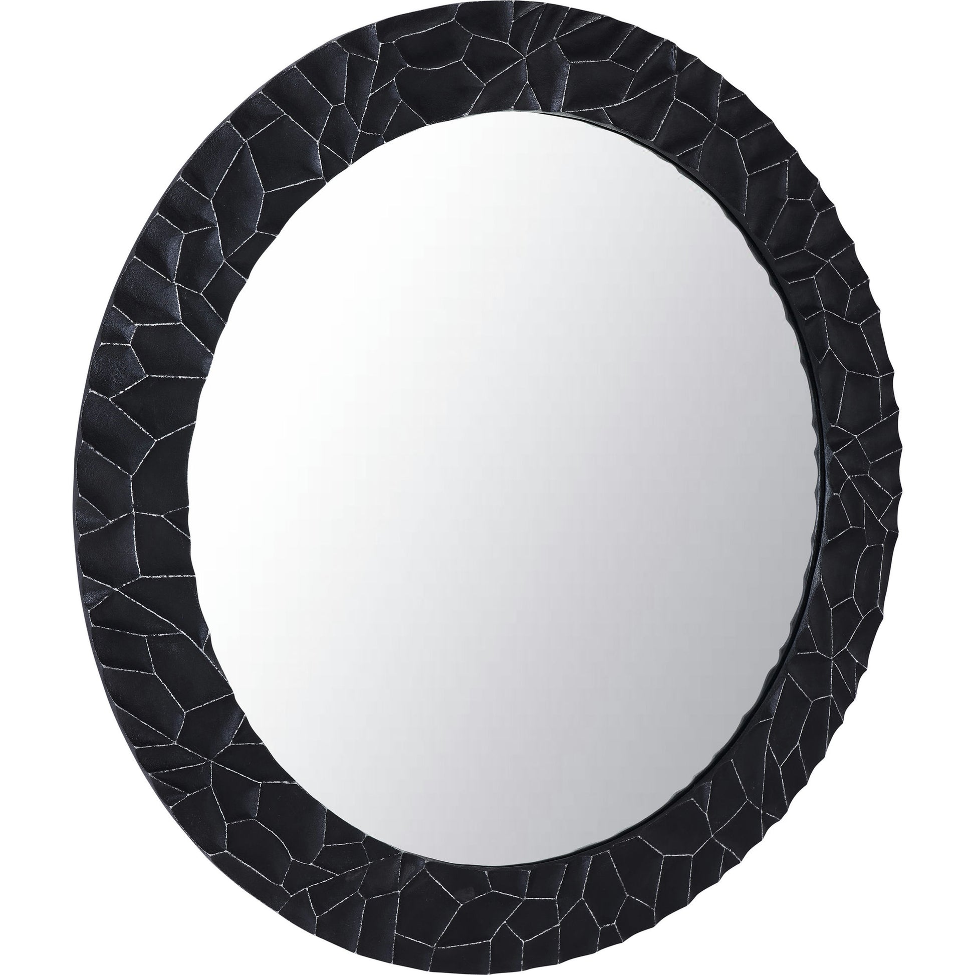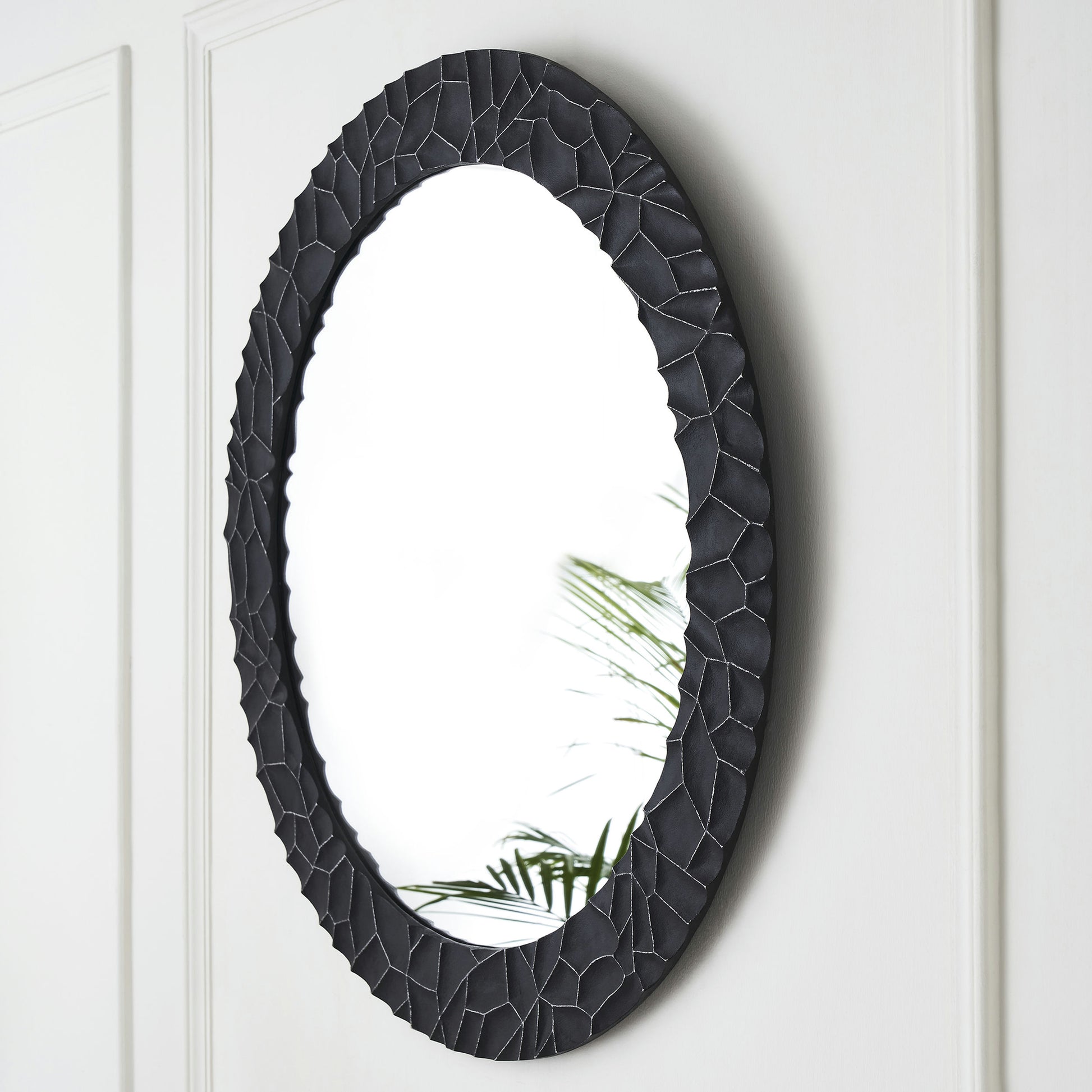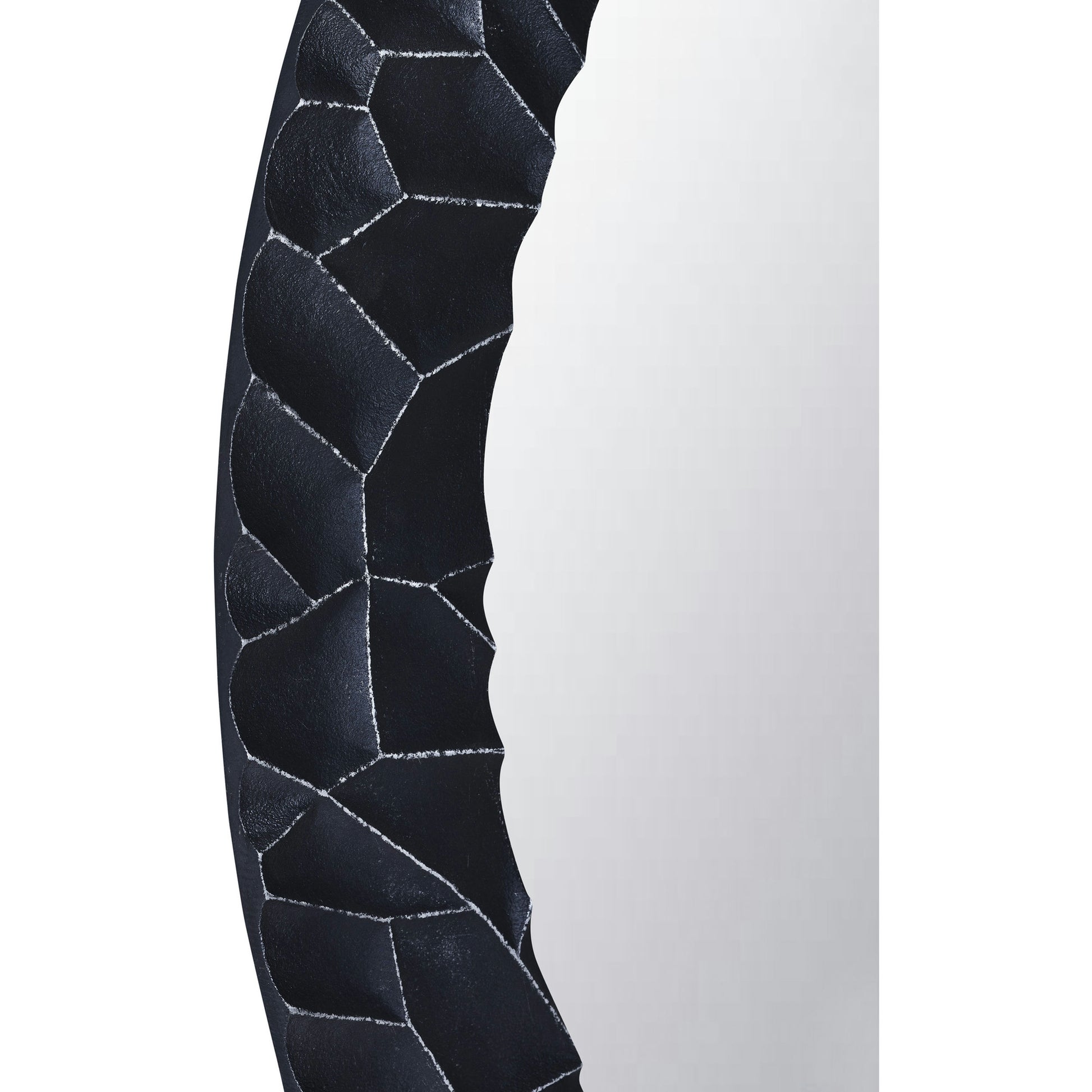 A tribal-like energy shines within this mirror design and out into the artistic interior. Showcasing a 36-inch circumference, it has the capability to capture a subject from the waist up or reflect back the beauty of the room. With a plated aluminum frame in charcoal with gray details, it proves engaging designs don't require vivid tones.