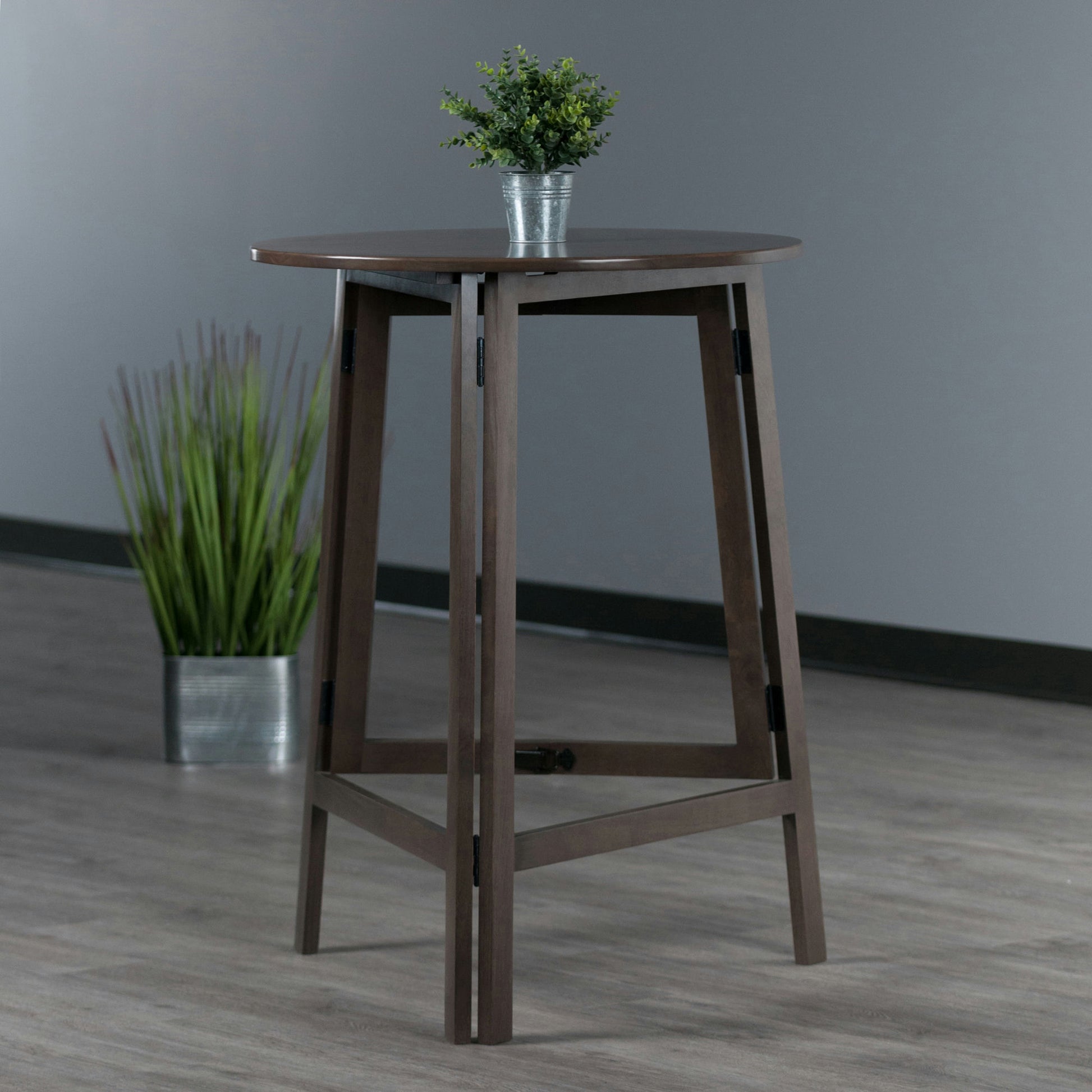 The Torrence High Table is uniquely-styled with a trilateral folding base. Made of Solid Wood in a contemporary Oyster Gray finish, the three crossbars and metal catch to lock the frame into place provide a sturdy base for the smooth, round tabletop. Folds to a slim 3" deep, allowing easy storage when not in use.