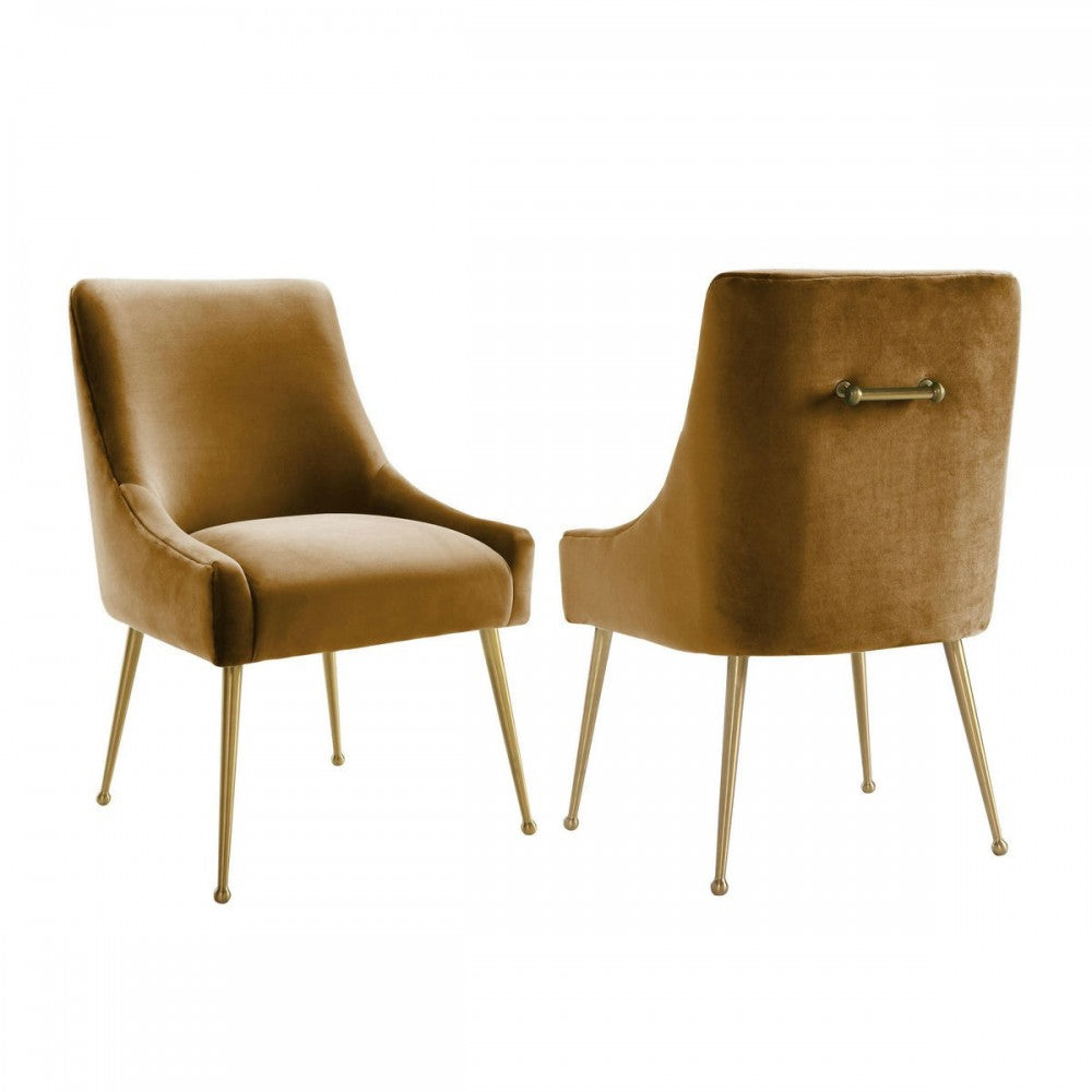 Sit pretty in this sumptuous yet durable velvet chair. The Beatrix dazzles as a dining chair or as an accent piece. Available in several colors with fab gold stainless steel legs and a matching handle on the back. Prop it into any room for a luxe, glamour effect.