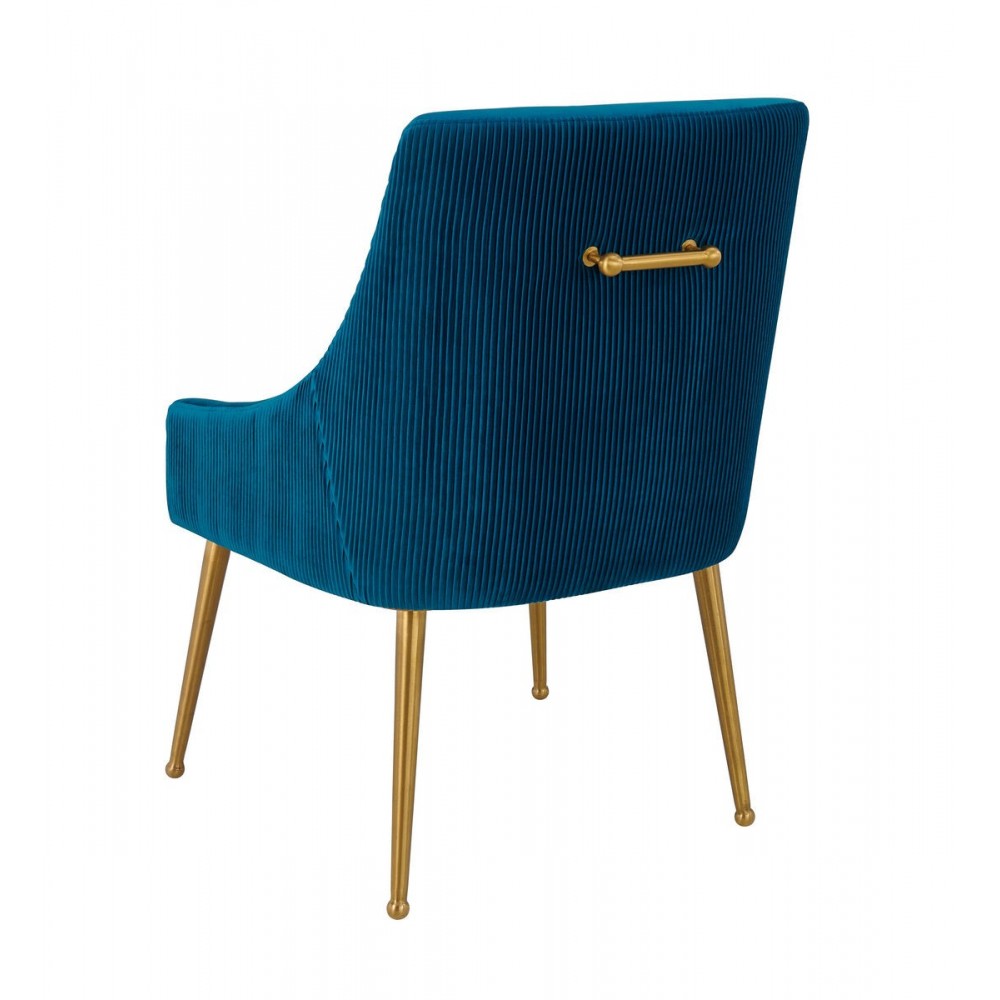 Sit pretty in this sumptuous yet durable velvet chair. The Beatrix dazzles as a dining chair or as an accent piece. Available in several colors with fab gold stainless steel legs and a matching handle on the back. Prop it into any room for a luxe, glamour effect.