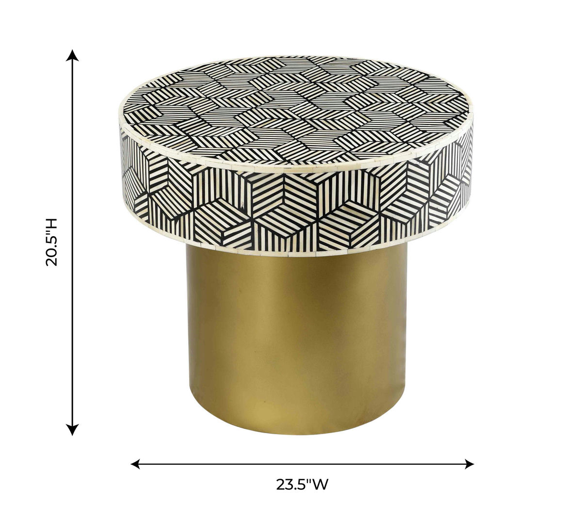 A gorgeous, geometric design is formed from meticulously inlaid hand-carved bone and complemented with a matte brass pedestal base. Available in cocktail and side table sizes, it'll stand out by itself or as a set.