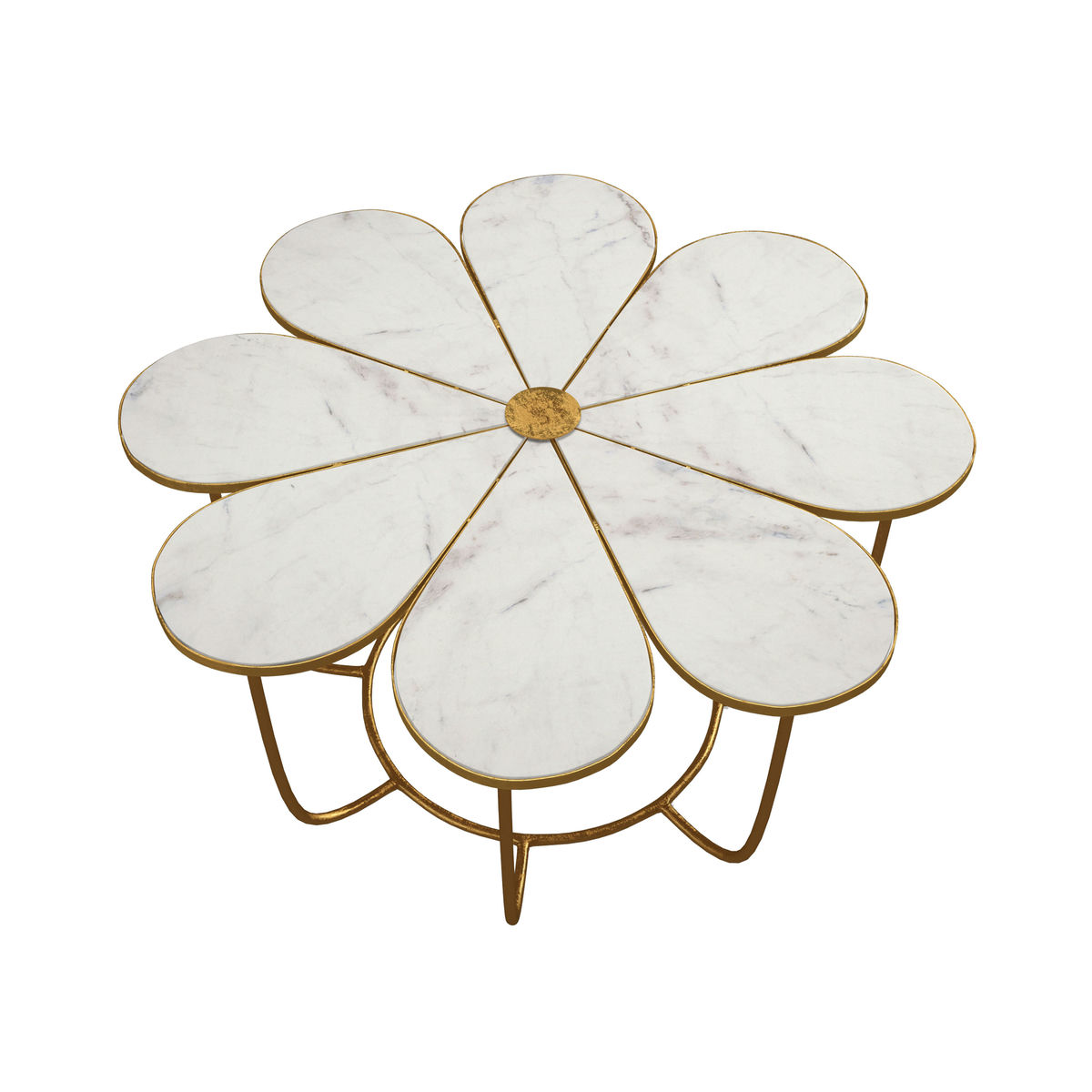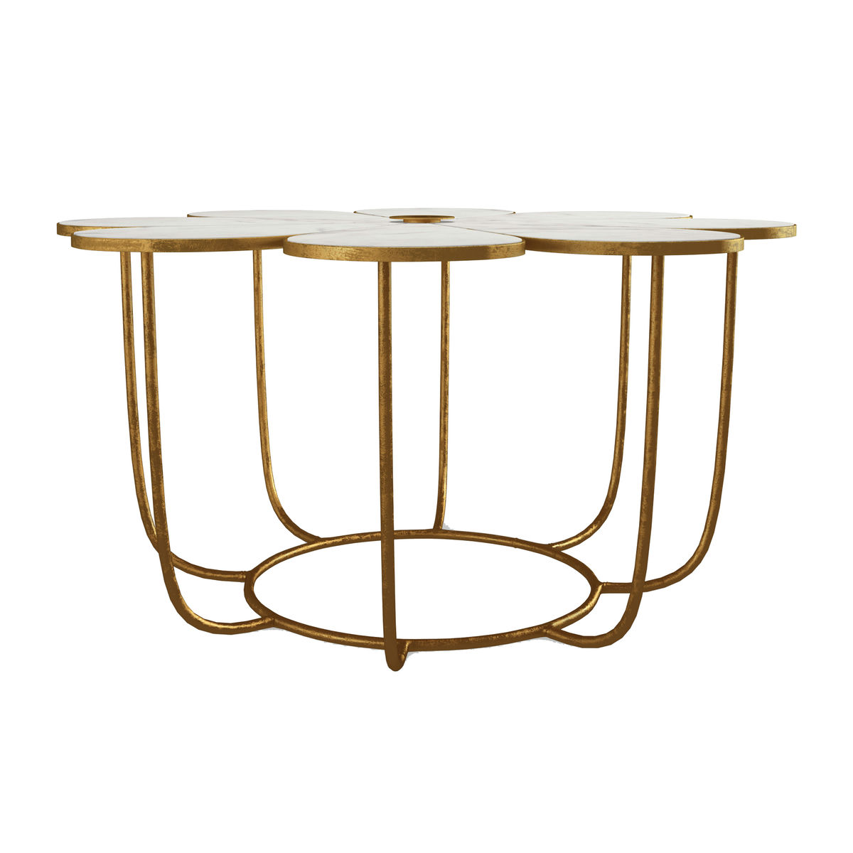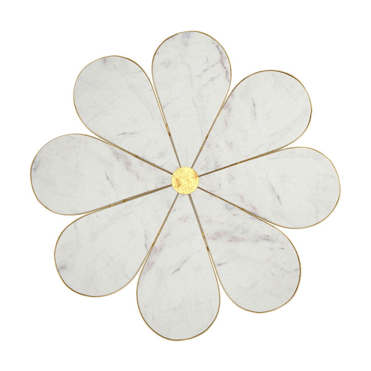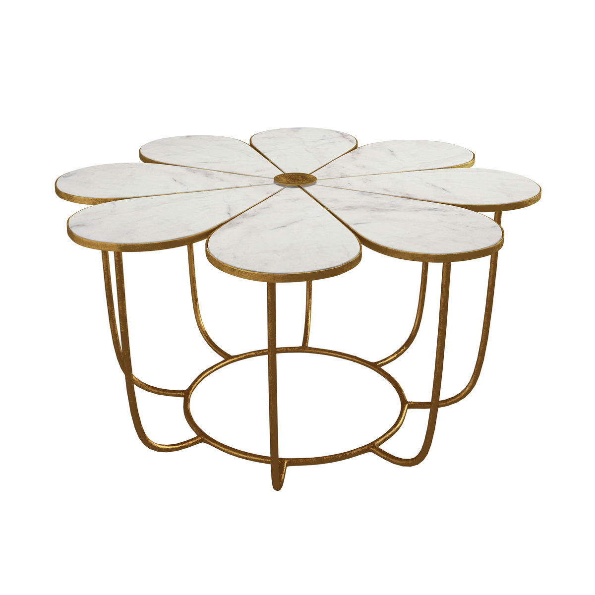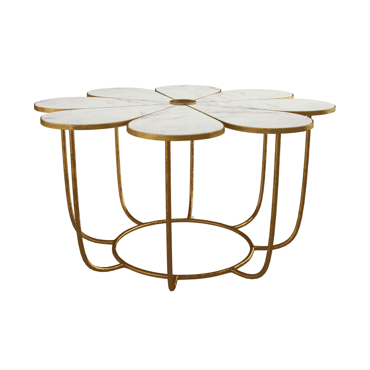 Glam design and botanical style. The flower cocktail table boasts a polished white marble top, gold finish and the framework of its namesake. Enhance your space with this eye-catching piece. As this is a handmade product, slight variations are to be expected and may result in small gaps between the marble and frame.