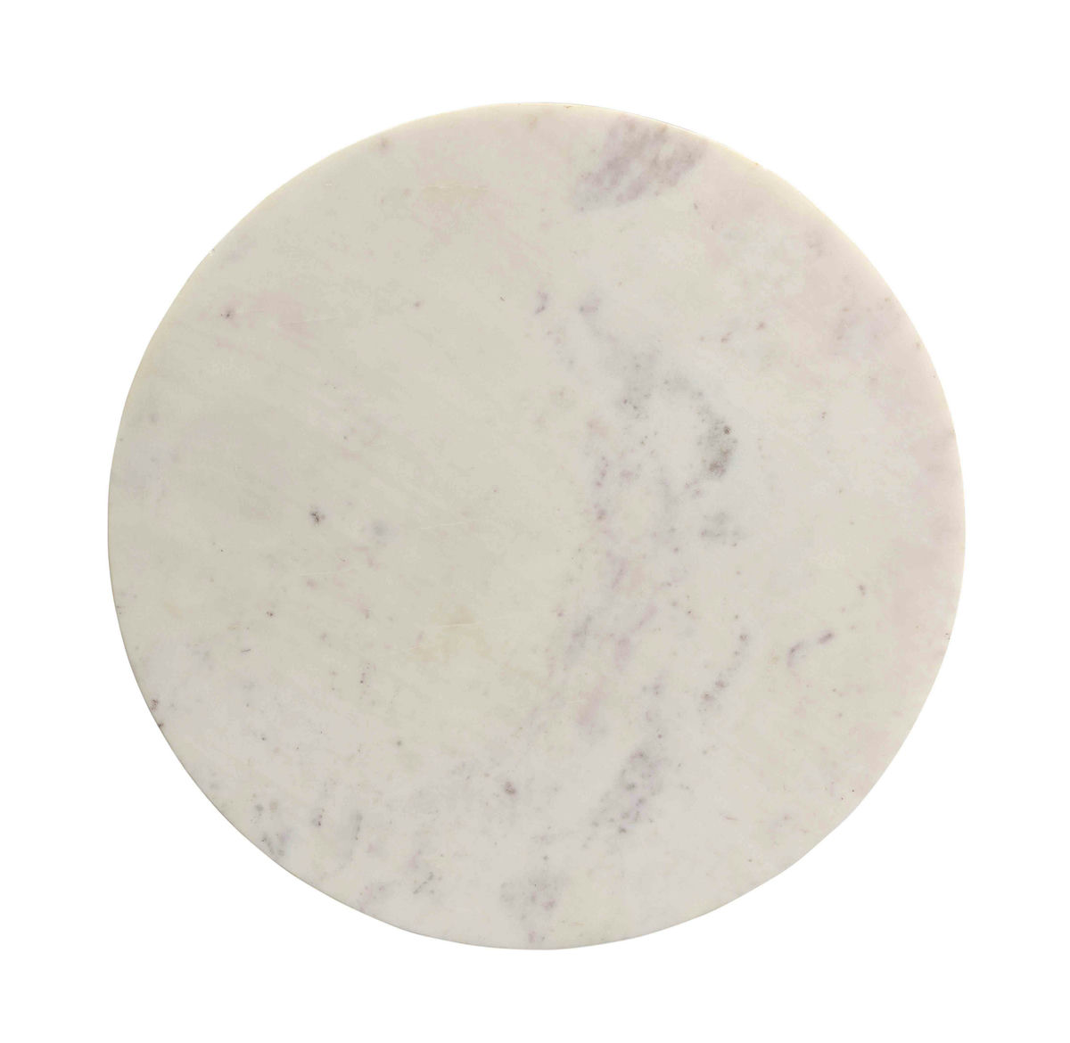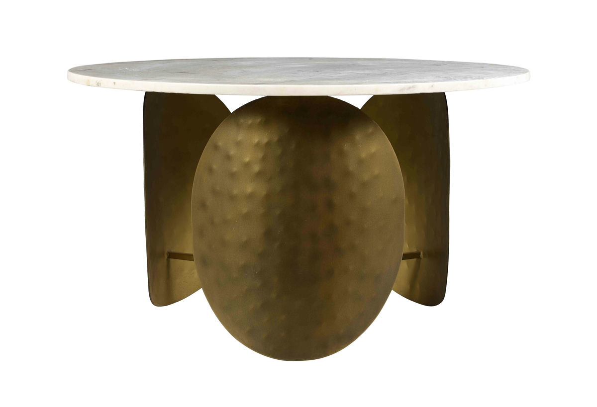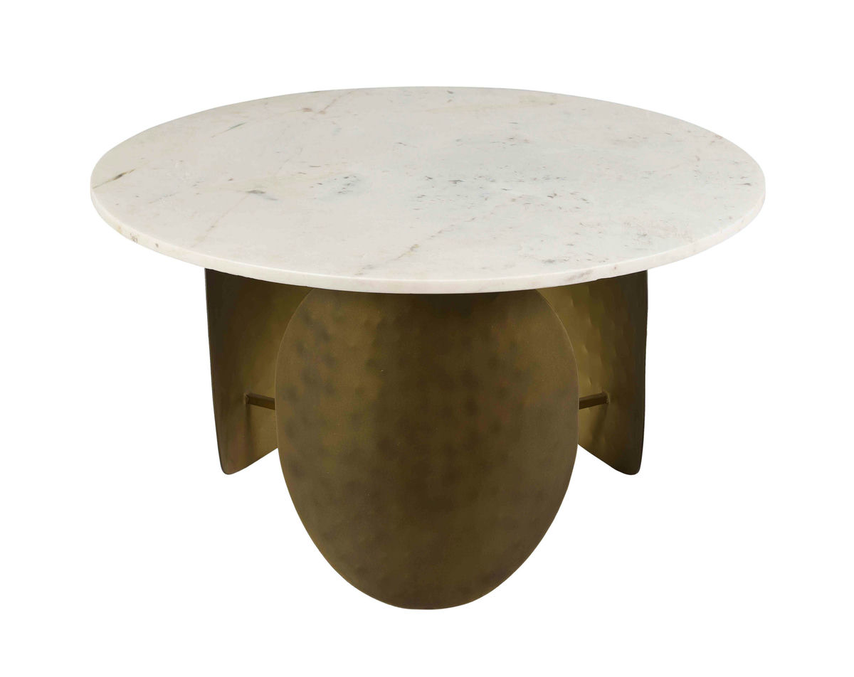 Hand-hammered antique brass ovals act as a solid base for a white marble top. Available in two sizes, this eye-catcher shines alone and as a set.
