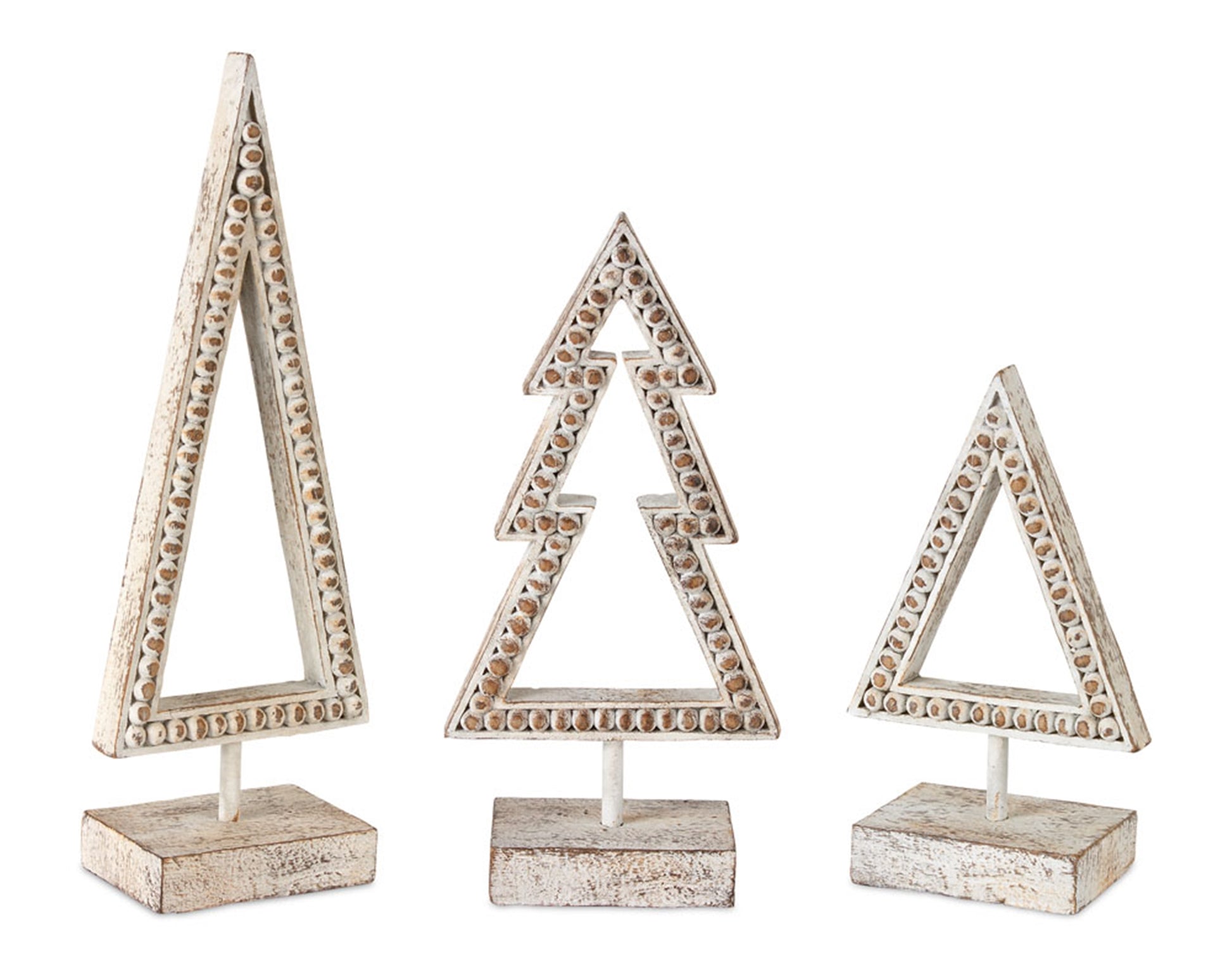 Enhance your holiday home decor with this stunning set of Holiday Cut-Out Tree decor. Featuring three assorted sizes, the beaded wood designs paired with the white-washed finish makes this set a great addition to any style of Christmas decor. The quality polyresin and metal composition is sure to last for seasons to come. Display the pieces together to make a statement, or display along with other decor to spread the holiday cheer.