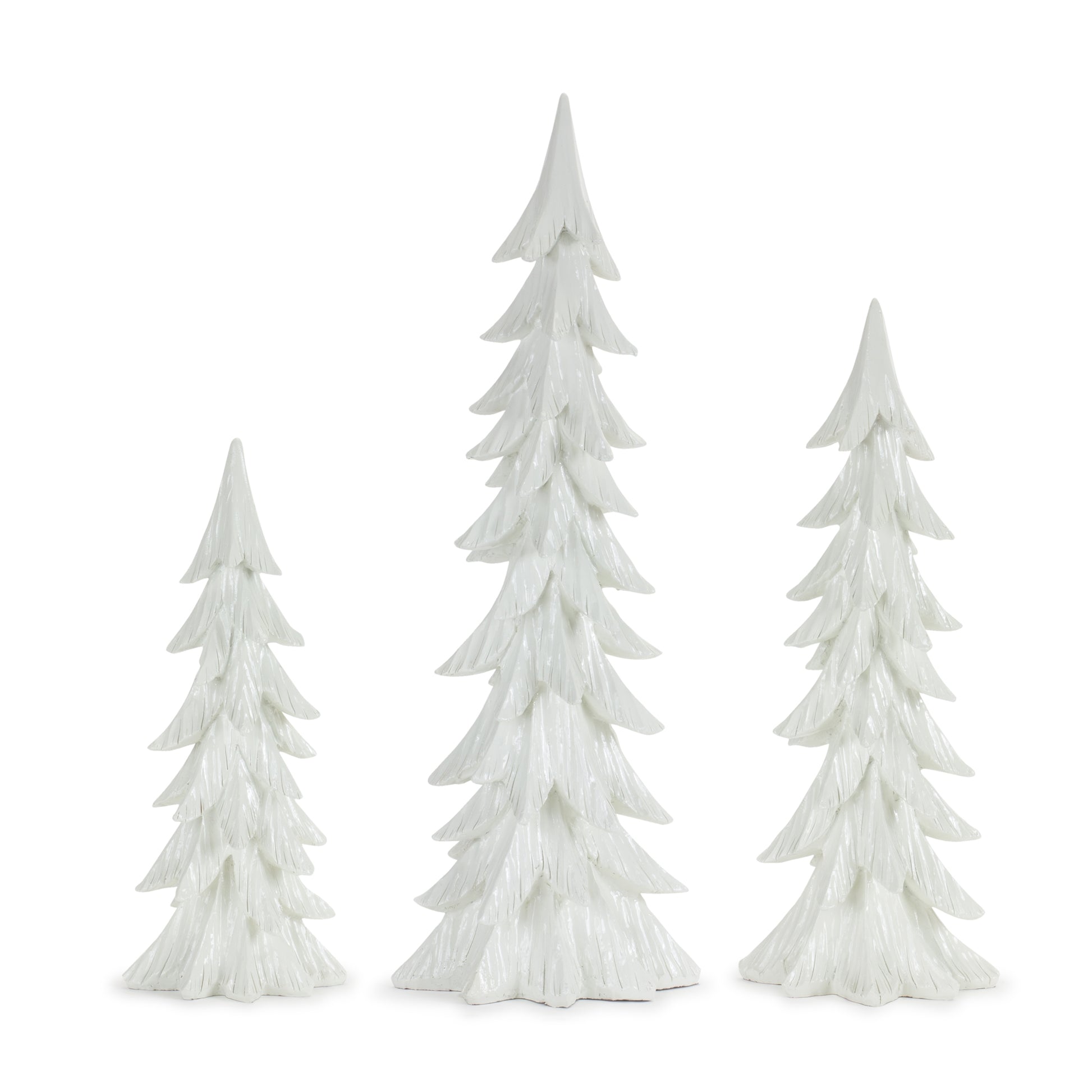 Enhance your holiday home decor with this beautiful set of Holiday Tree Decor. Featuring three assorted sizes, the traditional pine tree design paired with the bright white hues makes this piece the perfect addition to your Christmas decor. The quality polyresin and stone powder composition is sure to last for seasons to come. Display the pieces in a table centerpiece or mantle arrangement to add interest.