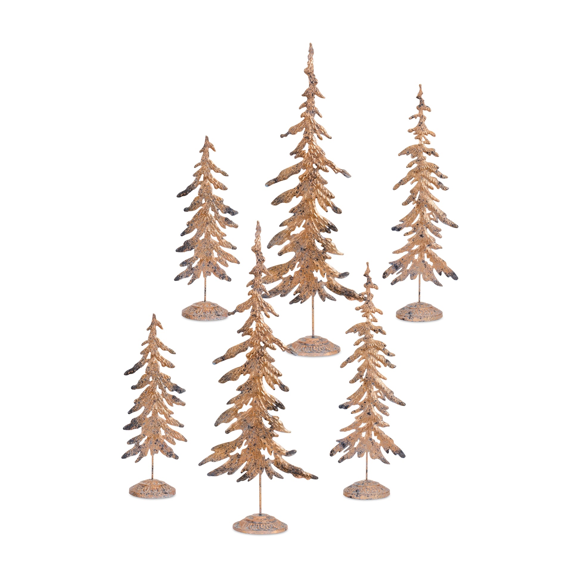 Enhance your holiday home decor with this beautiful set of Holiday Tree Decor. Featuring three assorted sizes, the modern cut-out design paired with the rustic brown finish makes this piece the perfect addition to your Christmas decor. The quality metal composition is sure to last for seasons to come. Display the pieces in a table centerpiece or mantle arrangement to add interest.