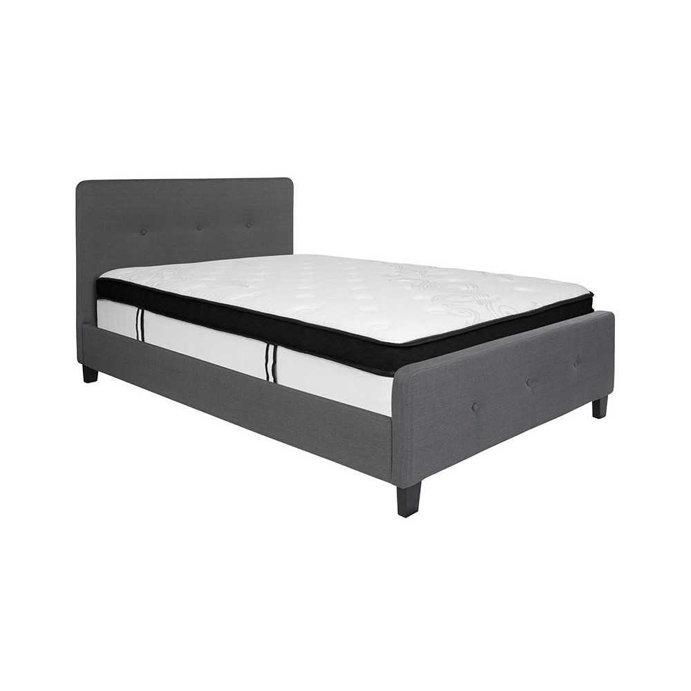 This modern low profile full sized platform bed and mattress in a box set is all that you need to get your beauty rest. Designed to give your room an open concept feel, the headboard's height allow you to fill your wall space with pictures and wall art. The button tufted headboard and footboard adds an extra element of style. The mattress sits atop 28 wooden support slats. The 12" memory foam and pocket spring mattress provides superior motion isolation and supports the contours of your body. The hybrid mattress consists of pocket spring coils and two layers of memory foam padding that provide a barrier between the springs for easy resting. The foam is CertiPUR-US Certified so it's free from heavy metals, phthalates, BPDE, formaldehyde and has reduced VOCs so you can rest easy knowing your indoor air quality won't be compromised.The mattress instantly starts expanding once you cut the plastic and will return to its original shape in 48 to 72 hours. This casually styled upholstered bed will fit in any teenager's bedroom or guest bedroom as a fashionable statement piece. [HG-BMF-30-GG]