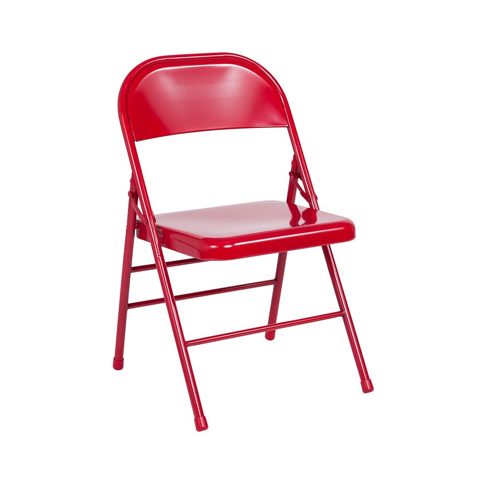 Strike a perfect balance between style and function. This durably constructed Metal Folding Chair will match any style and is a convenient option for everyday use or extra seating in a residential or commercial setting. It features a premium 18 gauge, curved steel frame. The legs are triple braced, with an integrated footrest, double hinged with riveted steel components and have a durable finish that will offer years of enjoyment. Though lightweight and easy to fold, transport and store, it's sturdy enough to hold up to 300 pounds. Non-marring floor glides on the legs protect your floors from scuffs and scrapes by sliding smoothly when you need to move the chair. Designed for indoor and outdoor use, store indoors to protect frame from excessive moisture. These attractive chairs are a smart seating solution for your next business meeting or special event [HF3-MC-309AS-RED-GG]