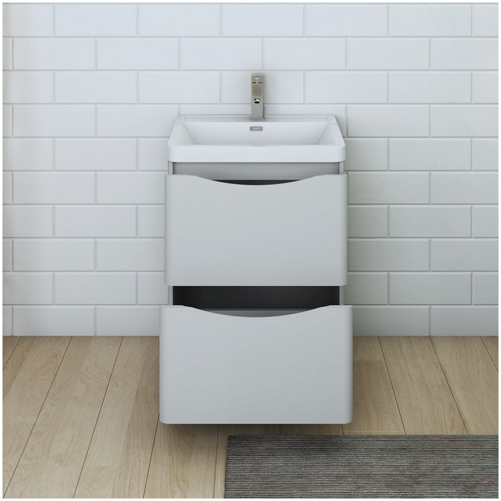 With its stylish Glossy Gray finish, the Fresca Tuscany Modern Bathroom Cabinet with Integrated Sink adds a contemporary touch to any bathroom. The free standing cabinet offers great storage with soft-closing drawers, just perfect for organizing all of your daily essentials. The drawers feature integrated handles that beautifully complement the minimalist look. Gracing the top of the cabinet is an eye-catching white acrylic-resin countertop/sink with a unique rimmed edge and integrated overflow. The sink has been pre-drilled to accommodate a single hole faucet (sold separately). This chic style will enhance any decor and is available in multiple sizes and finishes. It includes installation hardware