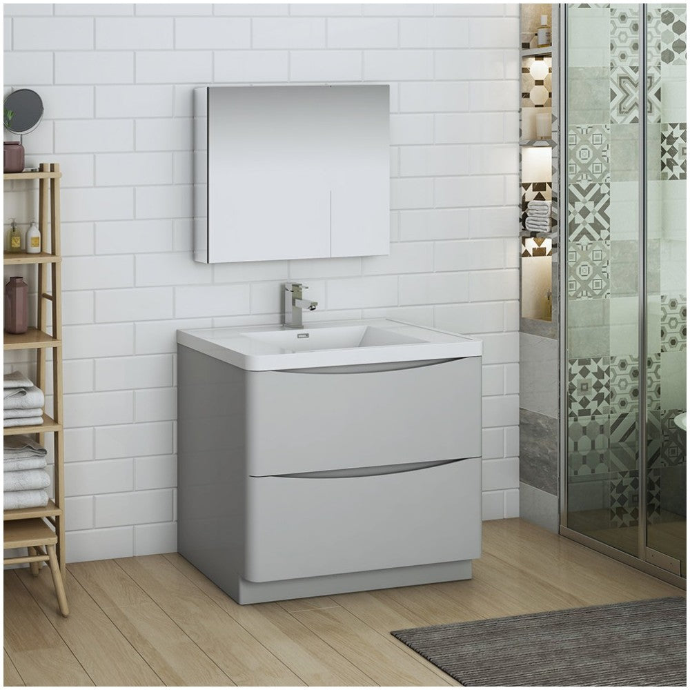 With its stylish Glossy Gray finish, the Fresca Tuscany Modern Bathroom Vanity adds a contemporary touch to any bathroom. The free standing cabinet offers great storage with soft-closing drawers, just perfect for organizing all of your daily essentials. The drawers feature integrated handles that beautifully complement the minimalist look. Gracing the top of the cabinet is an eye-catching white acrylic-resin countertop/sink with a unique rimmed edge and integrated overflow. The sink has been pre-drilled to accommodate a single hole faucet (included). It also includes p-trap, pop-up drain and installation hardware. This ensemble comes with a fully mirrored medicine cabinet with two adjustable glass shelves, to complete the look. This chic vanity ensemble is available in multiple colors and makes a stylish statement in any home