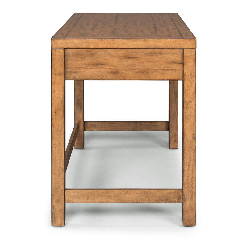 Contemporary design with a rustic aged toffee colored finish provides a great work area for smaller spaces. Crafted from popular solids and cherry veneers over engineered wood, with actual handed applied aged cracks and distressing in the wood to give an authentic rustic finish. 2 framed paneled lap drawers with brushed nickel drawer pulls. Side and back stretchers for added stability. Note finish and measurements may very slightly, assembly required. W-44", D-23.75", H-31.25"