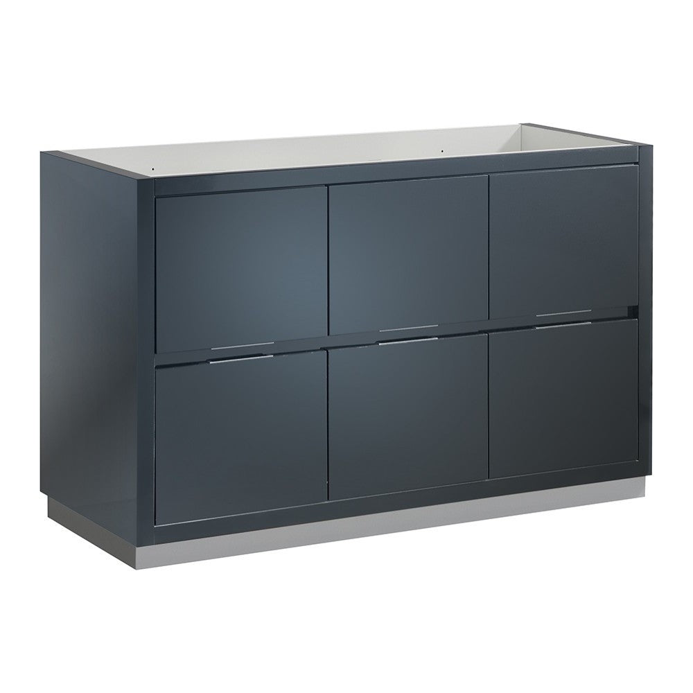 The Fresca Valencia Free Standing Single Sink Modern Bathroom Cabinet is the ideal starting point for creating an elegant and modern bathroom. The rectangular vanity offers great storage with six soft-closing drawers, just perfect for organizing all of your daily essentials. The drawers feature concealed aluminum handles and the cabinet has a stylish Glossy Dark Slate Gray finish. It rests on a silver base, adding to its modern look. This cabinet is available in multiple sizes and makes a stylish statement in any home