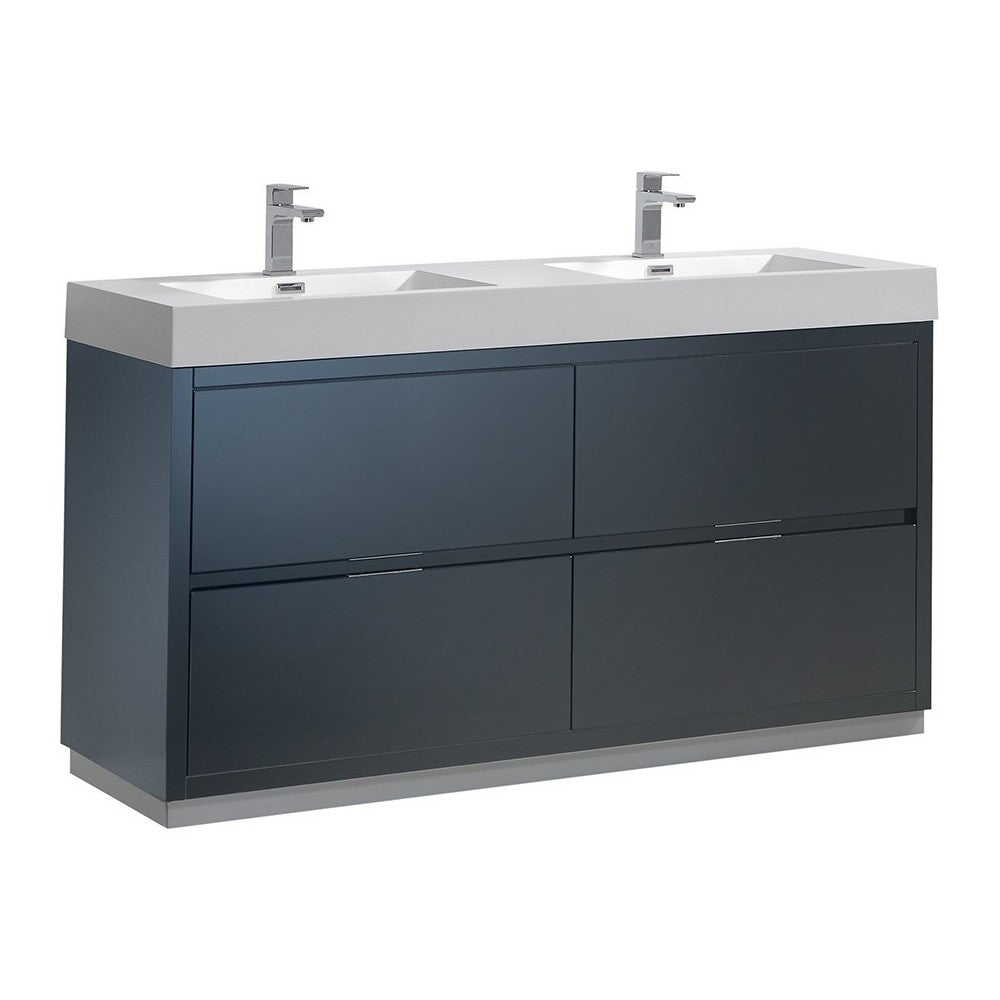 The Fresca Valencia Free Standing Modern Double Sink Bathroom Vanity is the ideal starting point for creating an elegant and modern bathroom. The rectangular vanity offers great storage with four soft-closing drawers, just perfect for organizing all of your daily essentials. The drawers feature concealed aluminum handles and the cabinet has a stylish Glossy Dark Slate Gray finish. It rests on a silver base, adding to its modern look. The white acrylic-resin countertop/double sink has smooth lines and a thick profile. It is equipped with an overflow and single hole faucet mounts, ready for the faucets of your choice (sold separately). This lovely vanity is available in multiple sizes and makes a stylish statement in any home