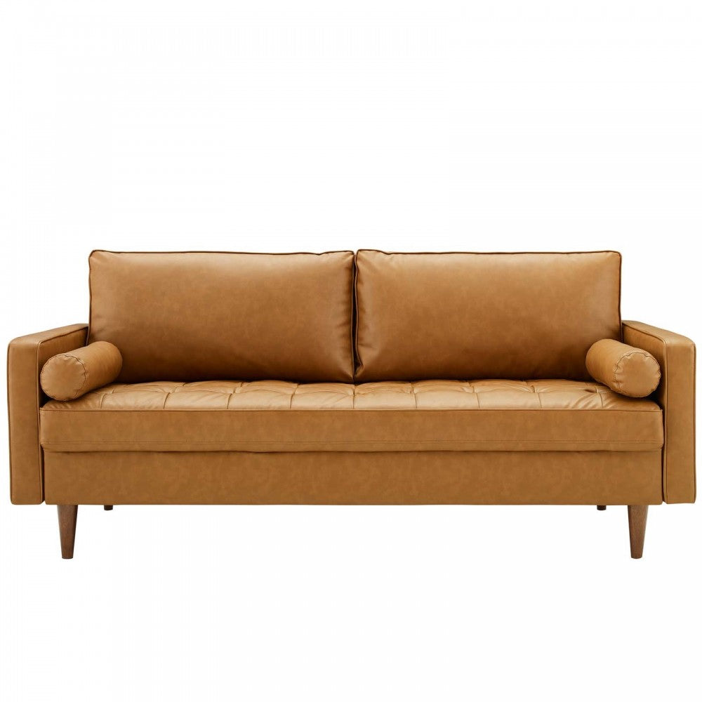 Update your home or apartment with the mid-century style and modern-day convenience of Valour. This comfortable living room sofa features a tailored profile with elegant biscuit tufting and two bolster pillows. Covered in smooth faux leather upholstery, Valour has dense foam padding, an innerspring pocket structure, and sinuous spring support for a comprehensive seating experience. This luxe modern sofa comes with walnut-stained wood legs with non-marking foot caps and supports up to 881 lbs. Say goodbye to the days of hauling heavy furniture. This tufted sofa ships in a portable box for easy maneuvering.