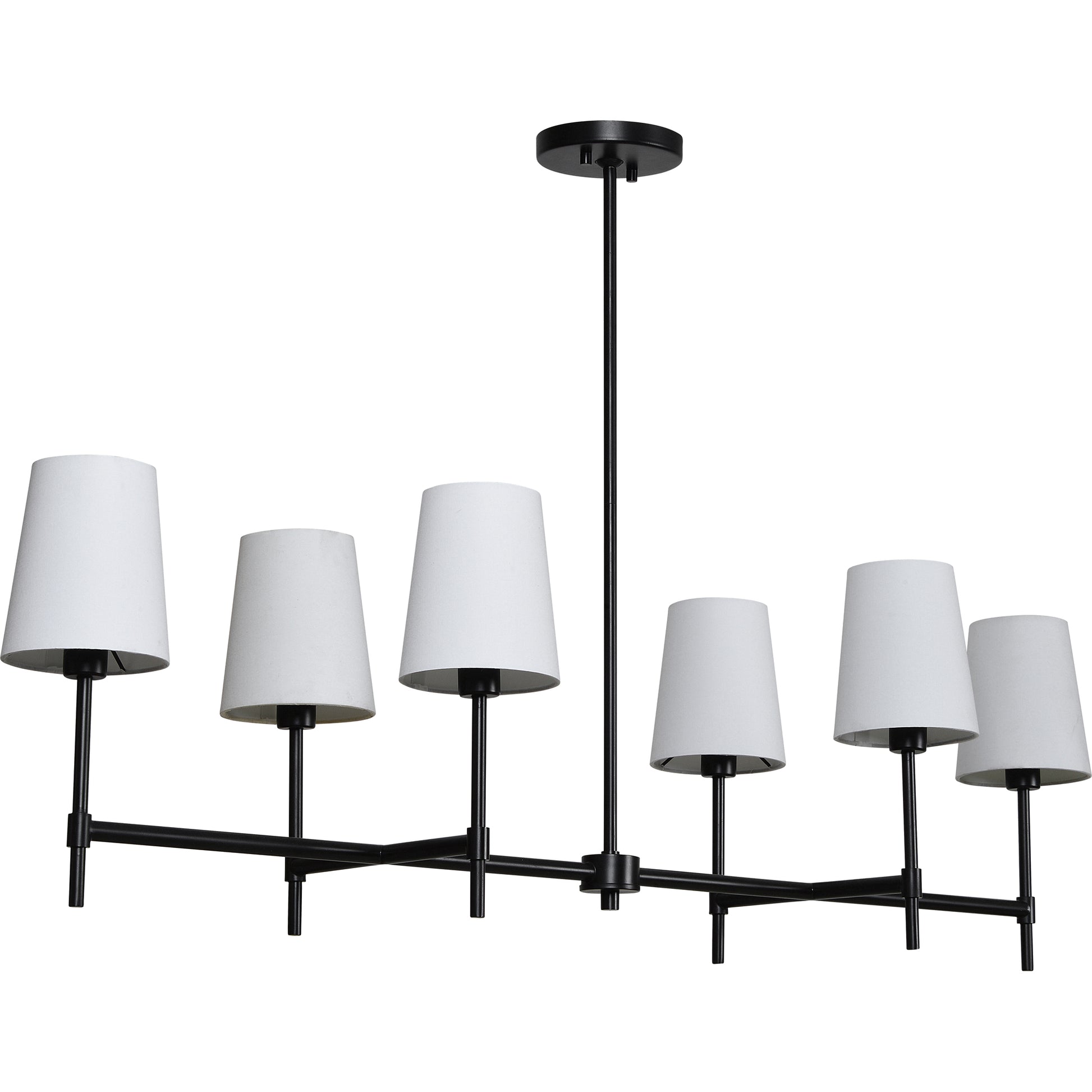 A traditional ceiling fixture design with a twist. This piece allows the dining or living space to feel classic cosmopolitan. The contrast of the matte black powder-coated iron build and light lamp shades is always pleasing to the eye whether lit or dimmed.