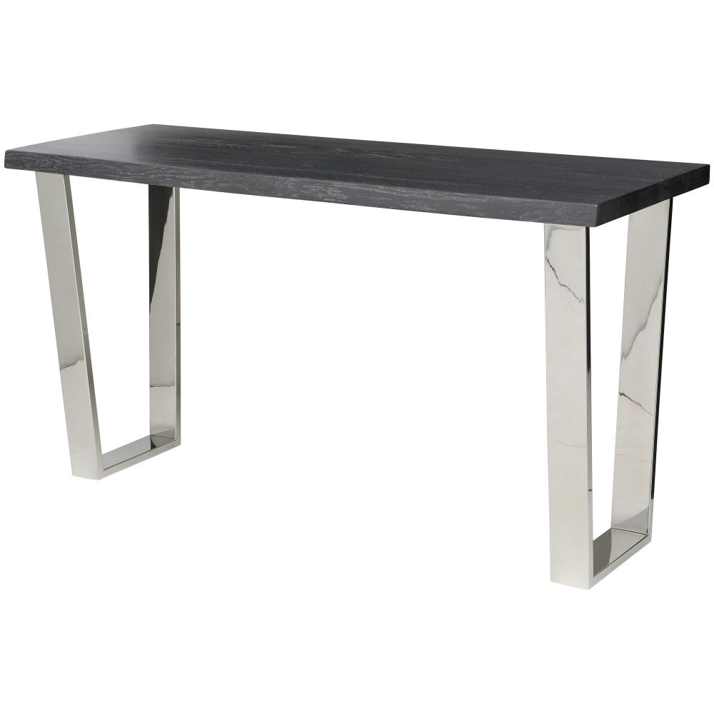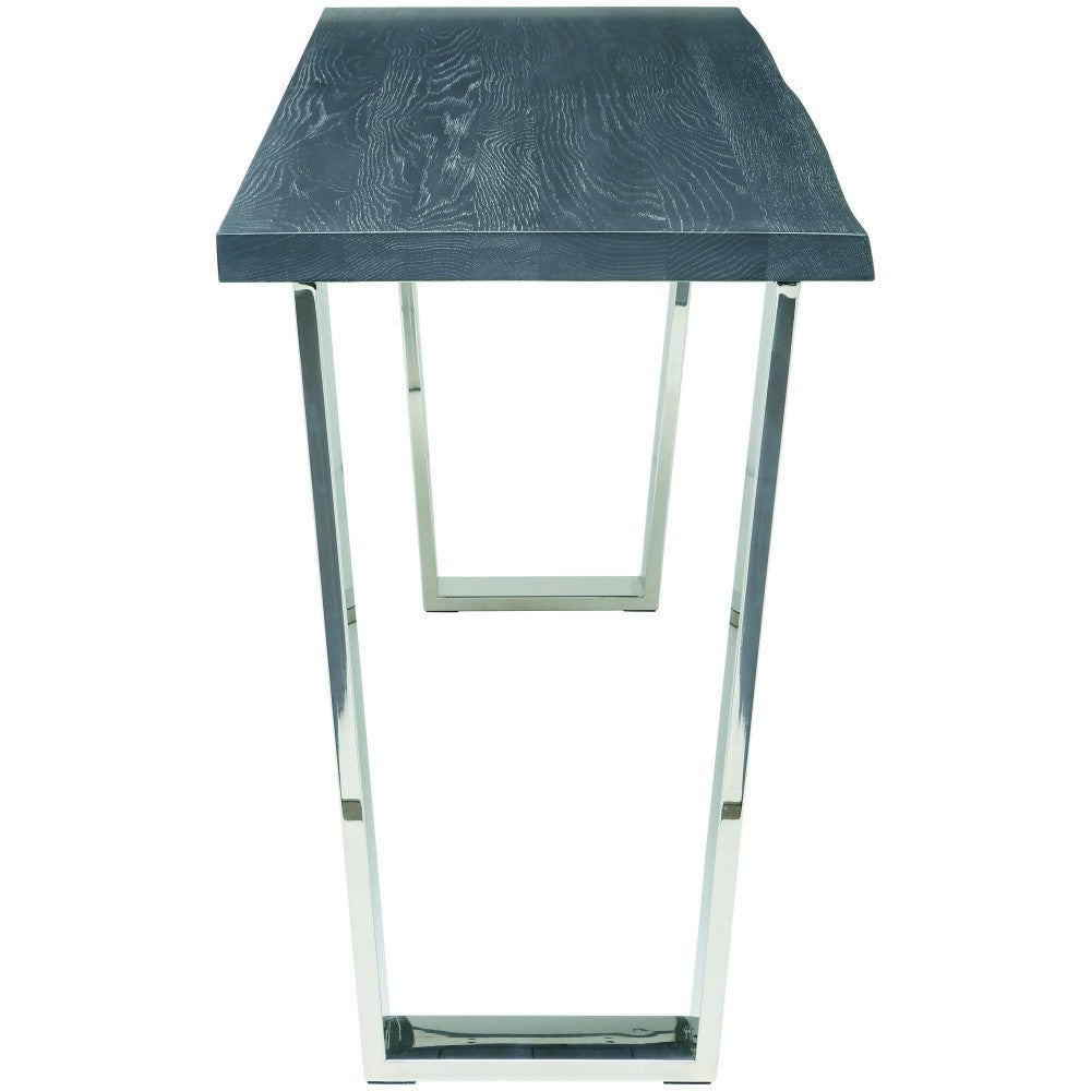 The Versailles console table pairs the rich texture of live edge solid oak in oxiidized Gray with the fine lines of polished stainless steel presenting an inspiring urbane, contemporary aesthetic.