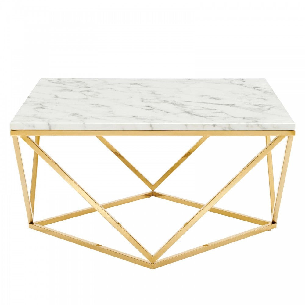 Redefine your home decor with the geometric design of the Vertex Coffee Table. A glamorous coffee table with modern appeal, this living room coffee table features intersecting lines to form triangular shapes that create the polished gold stainless steel base. A beautiful complement to the gold design, this coffee table boasts a square artificial marble tabletop to complete the look. Resting on non-marking foot caps, this artificial marble coffee table is perfect for the living room, lounge room, office, den, or bedroom sitting area. Assembly required.