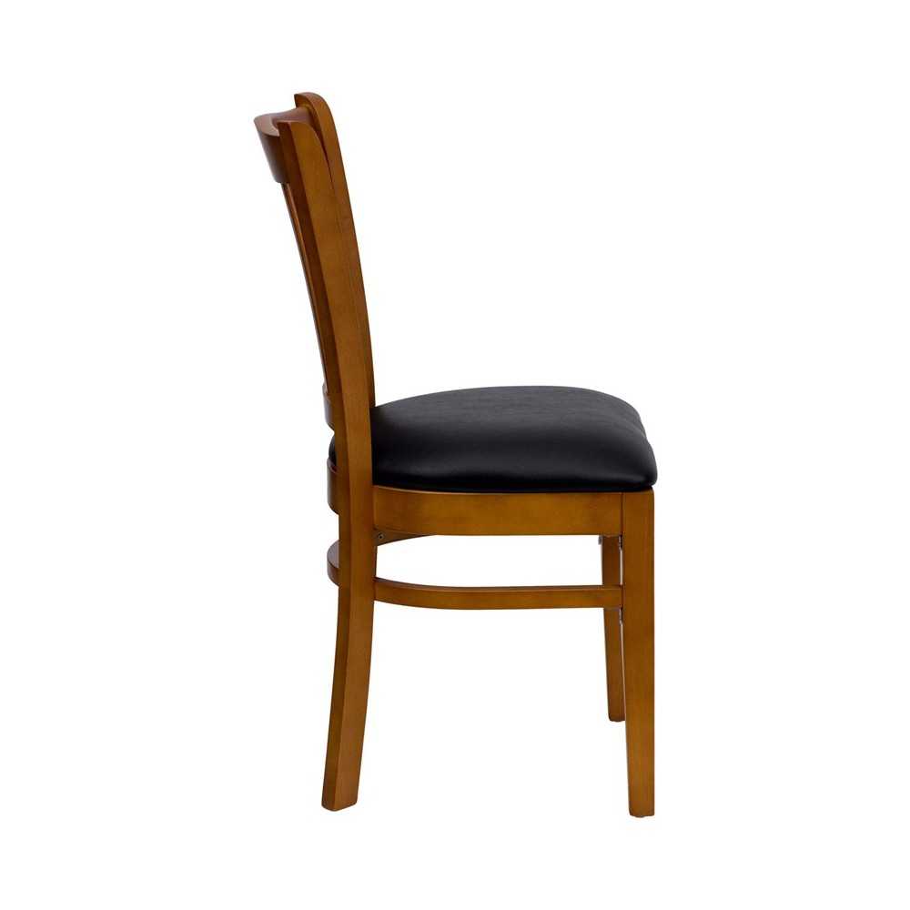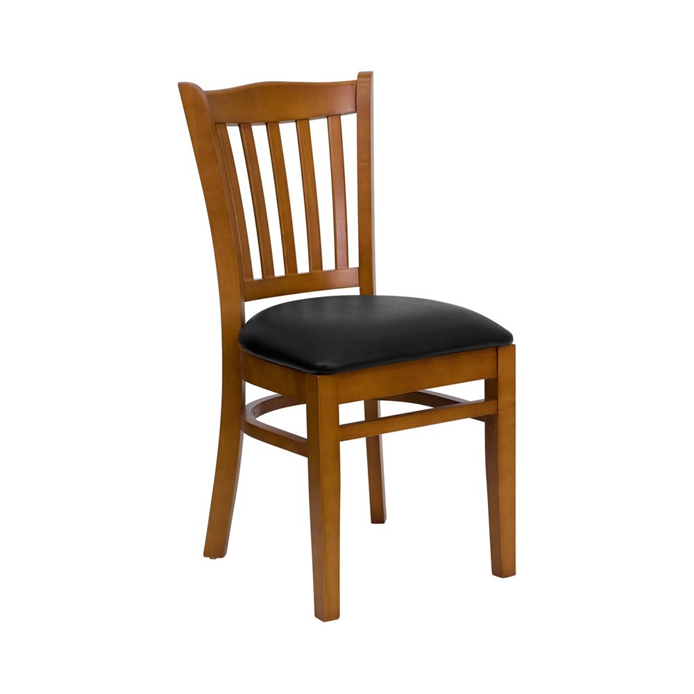Vertical Slat Back Cherry Wood Restaurant Chair - Black Vinyl Seat