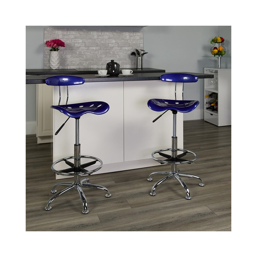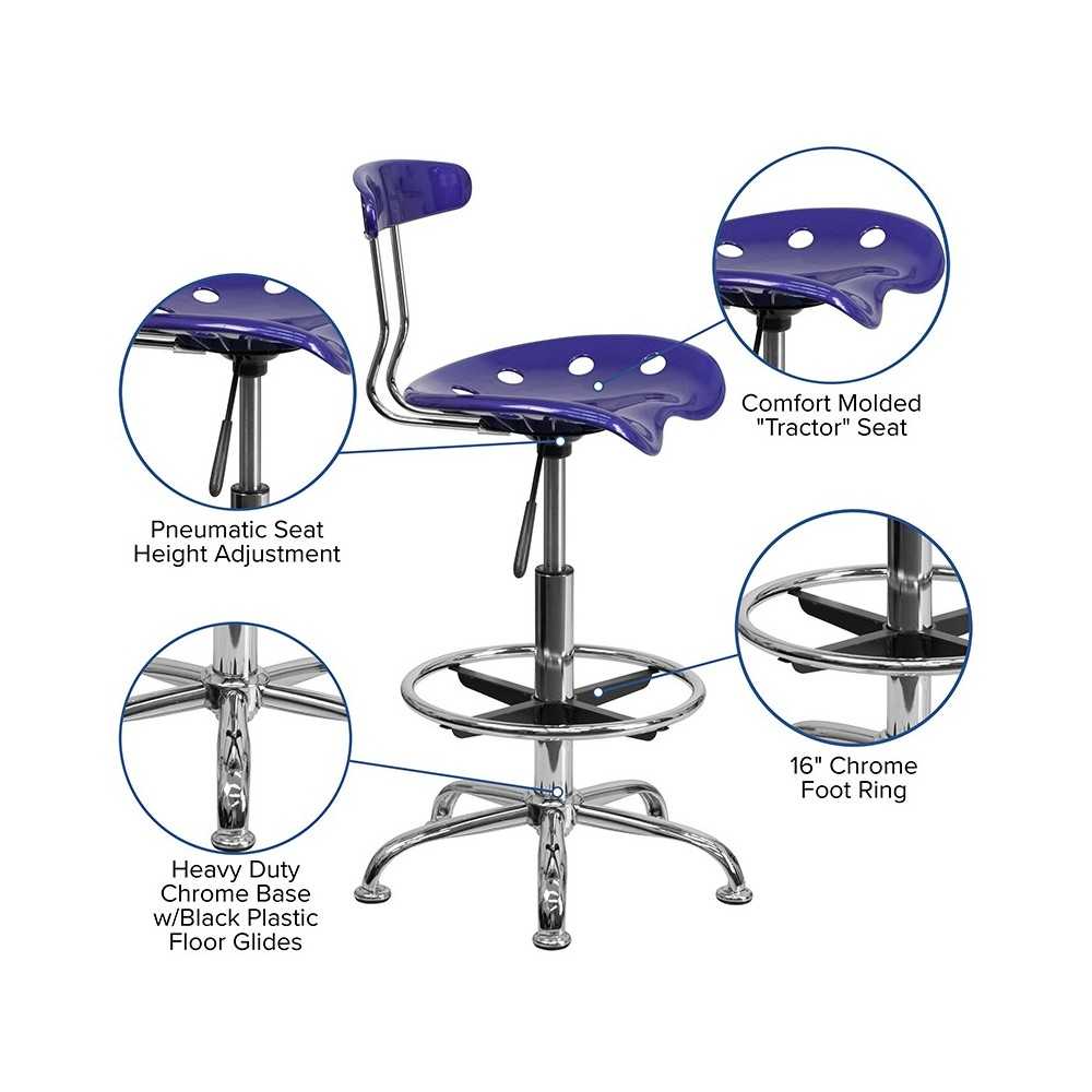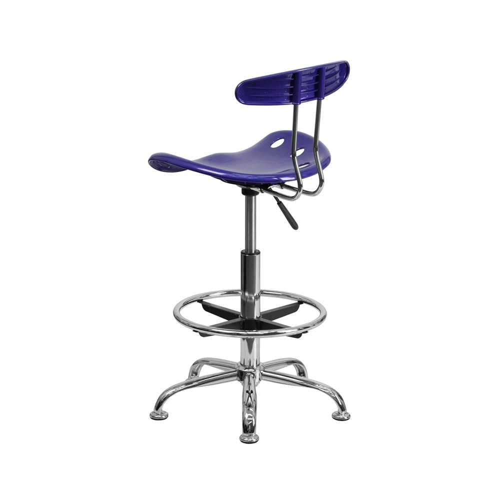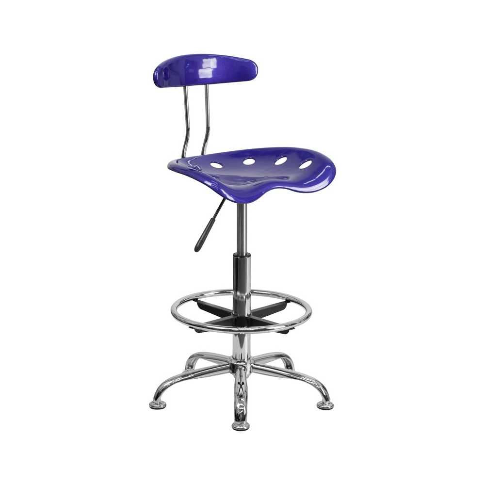 If you need a chair that is versatile enough for the workbench in your garage, stand-up desk in your home office and the island in your kitchen then this deep blue drafting stool with tractor seat is just the ticket. The back and swivel seat are made from high-density polymer for durability and a sleek, shiny finish and can be cleaned with a solvent and water based cleaner such as foam. Easily raise or lower the height of this drafting chair using the pneumatic adjustment lever, conveniently located under the seat. Plastic floor glides protect your floor by sliding smoothly when you need to move it and the heavy-duty, chrome base and foot ring complement the stool's modern design. This contemporary drafting stool with comfort molded tractor seat combines leading edge style with great functionality. [LF-215-DEEPBLUE-GG]