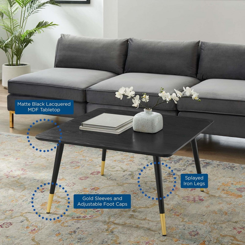 Bring modern influence to your living space with the deliberate style of the Vigor Square Coffee Table. Reflecting a seamless organic shape, this square coffee table sits atop four splayed iron legs with gold metal sleeves that bring a glamorous flair to the mid-century modern silhouette. This piece of living room furniture features a MDF tabletop embossed with matte black lacquer for a dark, striking look. Includes adjustable-height foot caps. Assembly required.
