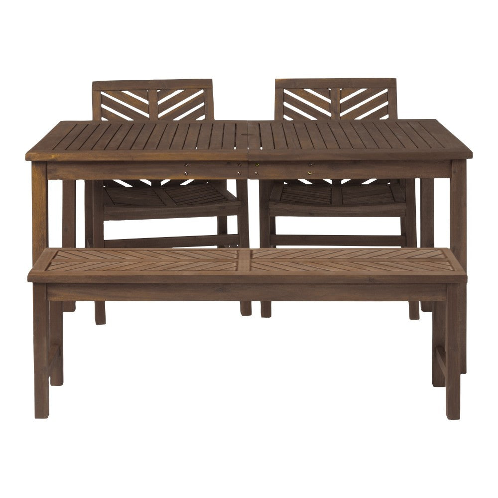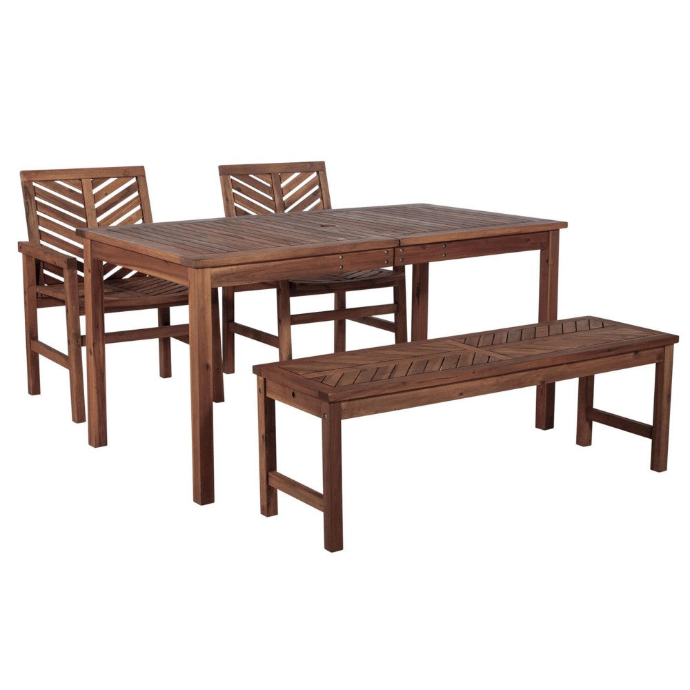 One part table, one part bench and two parts chair, this four-piece patio set is the perfect recipe to achieve your outdoor dining dreams. This solid acacia wood dining set is weather resistant and sturdy. The table features an umbrella hole so you can still enjoy eating in your backyard with some shade coverage. Both the chairs and bench have an engaging chevron slat design that would complement any number of outdoor designs.