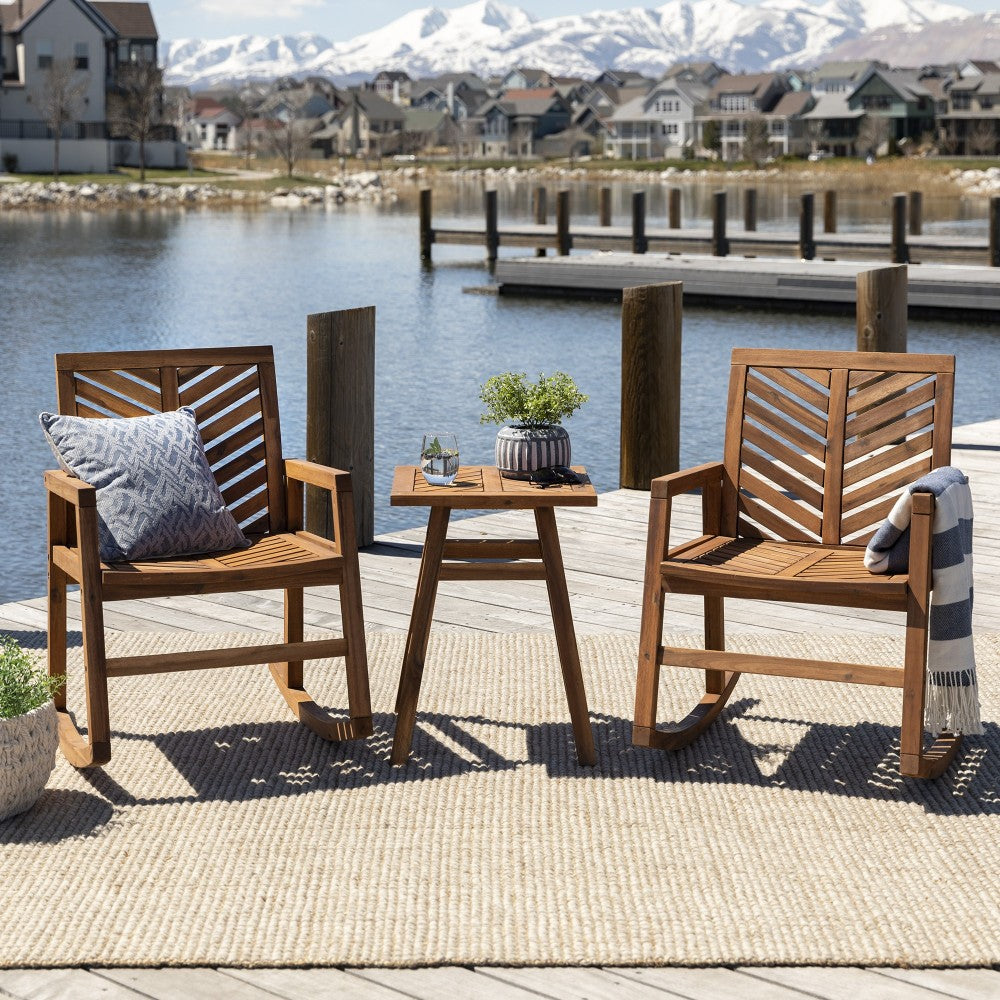 Let your outdoor living experience flourish when you invest in this solid wood rocking chair. Made of acacia wood, which is a highly weather resistant material, this patio rocking chair is sturdy and durable while its chevron pattern on the back and seat add charming flair to the overall design. This outdoor patio rocking chair is a great feature whether you're out in the backyard or on a sundry porch.