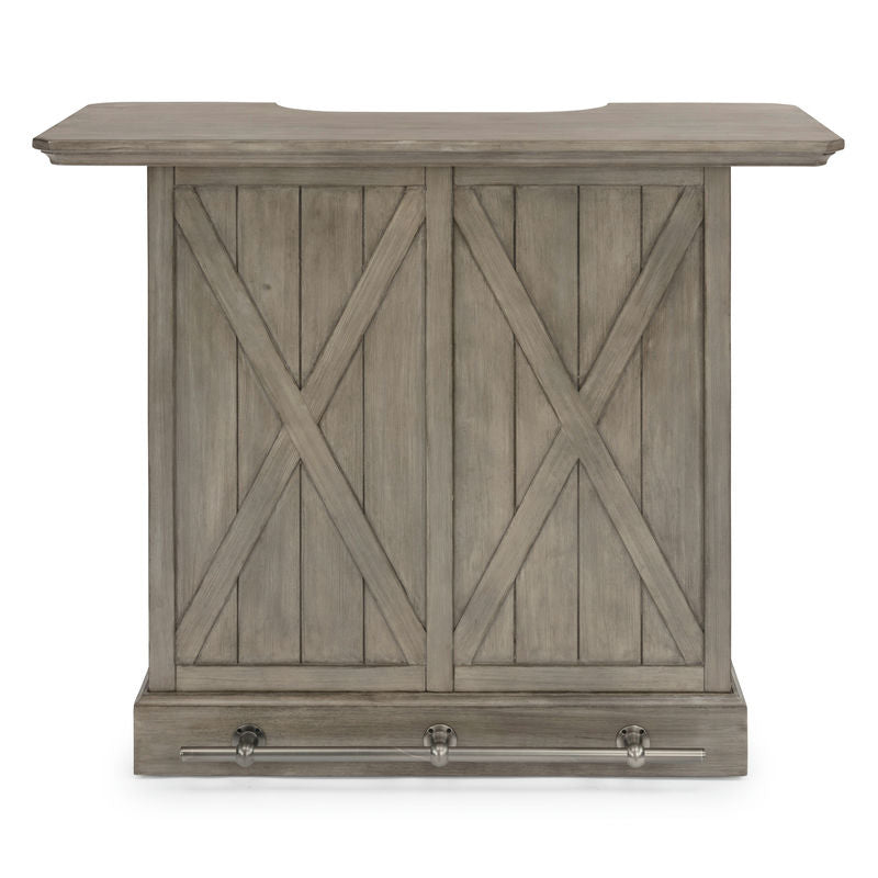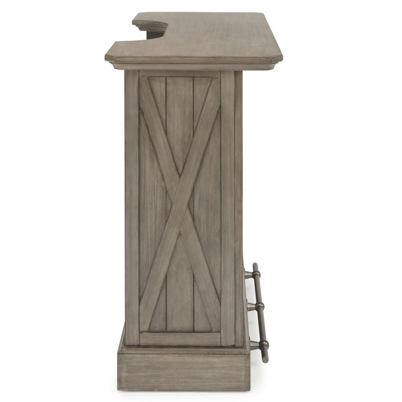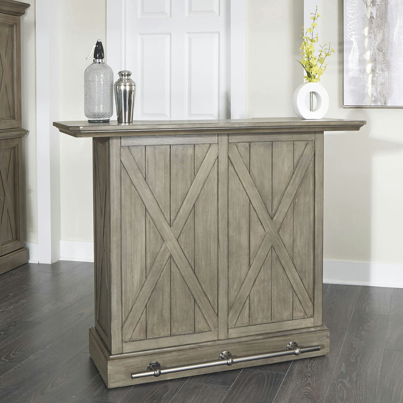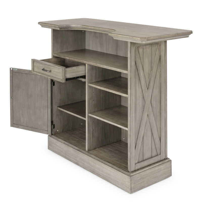 Rustic casual design that is at home in a Walker, as it is in a mid-town loft. Crafted of hardwood solids and veneers with engineered woods, that features solid wood “X" frame design, with inset wainscot panels, with all surfaces wired brushed to provide a rough-hewn look. Finished in a multi-colored gray that provides unique high lighting to the design. The Bar top features large overhang and cutout in back for easy access to serving shelf. Back featuring serving shelf, plus two adjustable shelves, a single drawer and closed storage area behind the door, with one adjustable behind. Arrives to your door by parcel delivery service. Note finish and measurements may vary, assembly required.