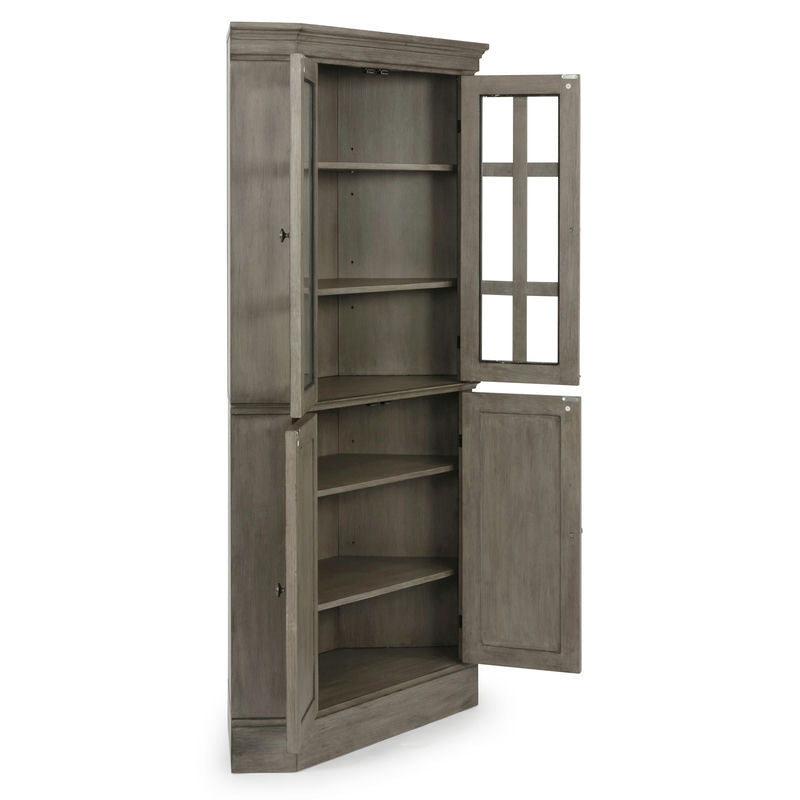 Rustic casual design that is equally at home in a Walker or mid-town loft. The Walker Corner Cabinet by homestyles is crafted of poplar solids and veneers with engineered woods and wire-brushed surfaces, providing a rough-hewn look. Inset wainscot panels with X-frame design cabinet doors. Finished in a multi-colored gray that adds unique highlighting to the design. Two upper doors feature tempered glass with outer molding, opening to two adjustable shelves. Lower doors open to two adjustable shelves. Door pulls are antiqued nickel-finished. Arrives at your door by parcel delivery service. Finish and measurements may vary, with assembly required. Measures: 72"H x 40.5"W x 16.25"D.