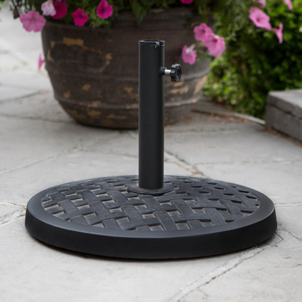 Provide a stylish foundation for your umbrella with our outdoor umbrella base featuring a woven design. Made from sturdy polyresin with interchangeable sizing inserts and an adjustable tightening knob, this umbrella base provides support to most umbrellas. Create a shaded area for you and your loved ones to have a family picnic together or when relaxing out on your patio or porch.
