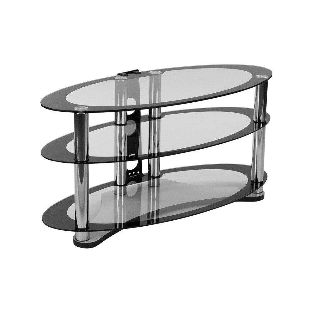 Dare to be different and add some panache to your decorative pallet. Featuring oval shaped tempered glass shelving, this gorgeous TV stand is an excellent choice for any modern space. This cutting edge entertainment stand features a removable wire management panel to keep all of your cords in place. The chrome tubular legs finish off the look and floor glides help protect your flooring. This stunning TV stand is highlighted by a two-tone glass finish. The oval shaped shelves not only make an attractive appearance, but offer a slim silhouette that allows you to decorate in style even in small spaces. [NAN-OPAL-GG]