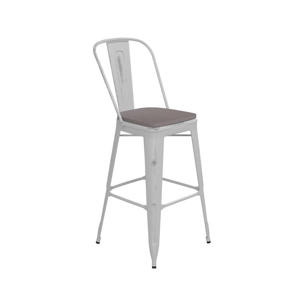 Refresh the seating in your indoor or outdoor entertaining spaces with this colorful metal bar stool with an all-weather poly resin seat. Whether setting up a cozy space in your kitchen to enjoy a light breakfast or appointing your restaurant or bistro, you'll be pleasantly surprised how well these metal bar stools blend in with your existing furnishings. Constructed to hold up in commercial settings, this dining bar stool will instantly modernize your restaurant, cafe, or bar by adding splashes of color. Mix and match colors and chair heights for a fun, energetic feel. The full back is ergonomically curved and includes a vertical slat while the lower support bracing doubles as a footrest, promoting proper posture and an improved sitting experience. The polystyrene seats will not rot, chip, or peel to provide years on long-lasting use. Assembly takes less than 10 minutes with the included tools and cleanup is quick and easy with water and a neutral detergent. [ET-3534-30-WH-PL1G-GG]