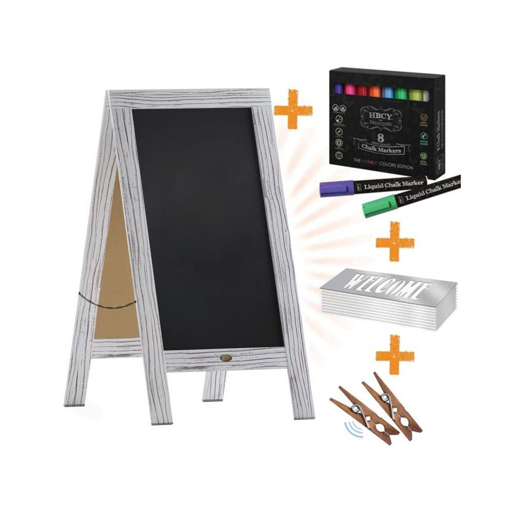 Everything you need to welcome guests to your restaurant, retail store, birthday party, or baby shower is included in this indoor/outdoor wooden framed message board set available in 6 colors. Create your custom messages and place this chalkboard on the sidewalk to advertise your daily specials or inside your venue to direct wedding guests to the correct reception area. Constructed from solid pine, this wind resistant sandwich board features heavy duty hinges and security chains on both sides. The double sided, non-porous, magnetic chalkboard display is designed for regular chalk as well as liquid chalk and cleans easily with the included eraser or a damp cloth. This set includes 8 chalk markers, 10 stencils and 2 magnets to get you started and wipes clean with the included eraser or a damp cloth. [HGWA-GD1I-CRE8-842315-GG]