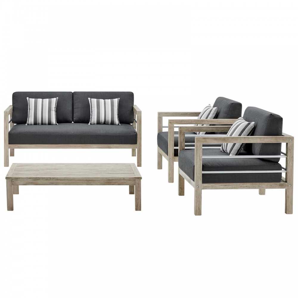 Invoke the refreshing feel of coastal accents with the Wiscasset 4 Piece Outdoor Set. This FSC certified Acacia wood set includes the two-seater loveseat, two armchairs, and a coffee table. Densely padded all-weather cushions come with durable machine washable covers. This modern outdoor set will effortlessly enhance the decor of your patio, deck, porch, or poolside.