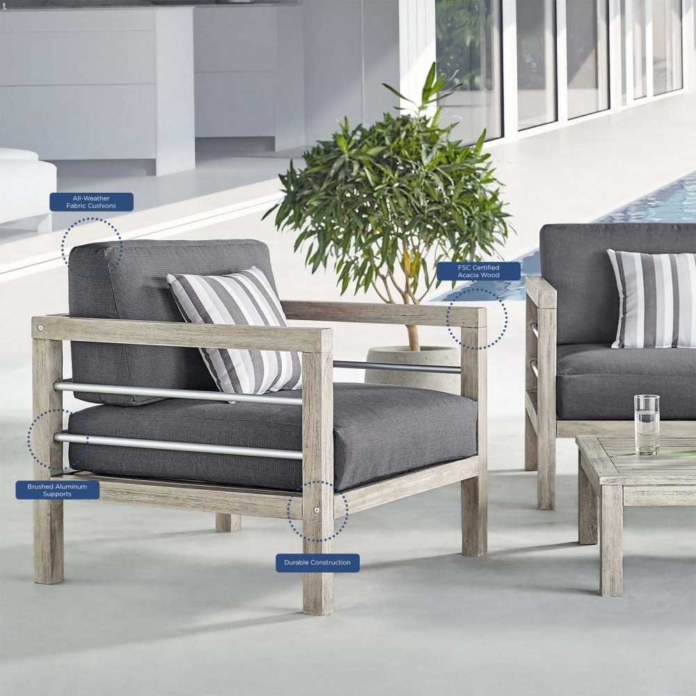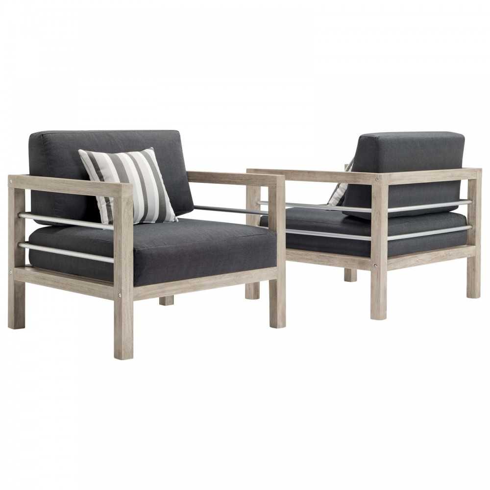 Invoke the refreshing feel of coastal accents with the Wiscasset Outdoor Patio Wood Armchair Set of 2. This FSC certified Acacia wood chair has a slatted base with a reinforced center beam and matte aluminum supports for a strong seating experience. Densely padded all-weather cushions come with durable machine washable covers. This modern outdoor armchair will effortlessly enhance the decor of your patio, deck, porch, or poolside. Chair Weight Capacity: 331 lbs.