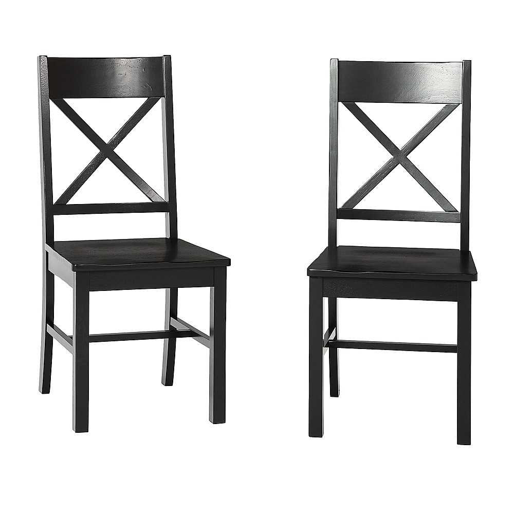 Round out your traditional dining room set with these X-back wood dining chairs. Sturdy and durable these chairs feature man-made distressing and antique finishes on several of the color variations, that add a sense of history, tradition and memory. These classic chairs keep comfort in mind by including contoured seats. H-stretchers provide extra support while also creating a place you can rest your feet on amidst your family meals or friendly conversations. Set includes two chairs.