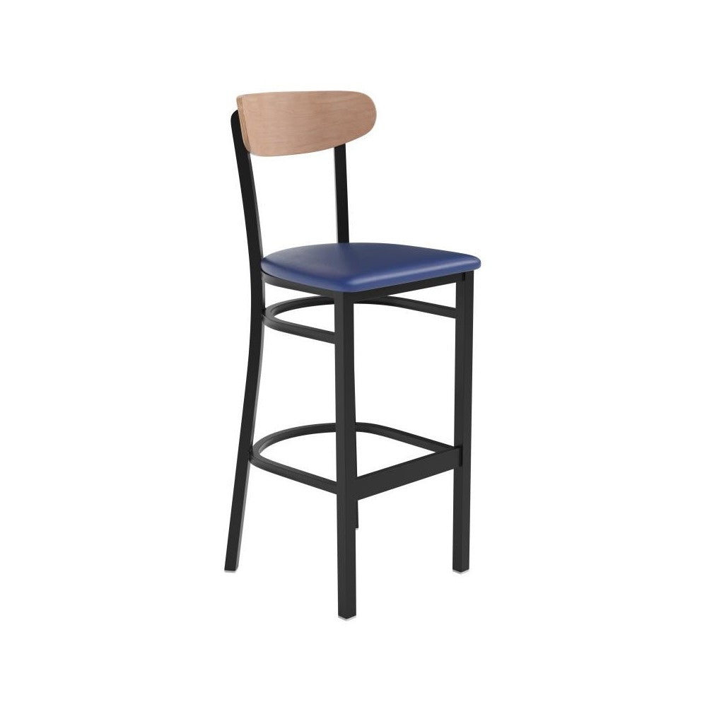 - Commercial Bar Stool with Vinyl Upholstered Seat and Wood Boomerang Back