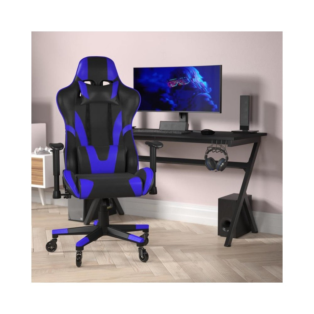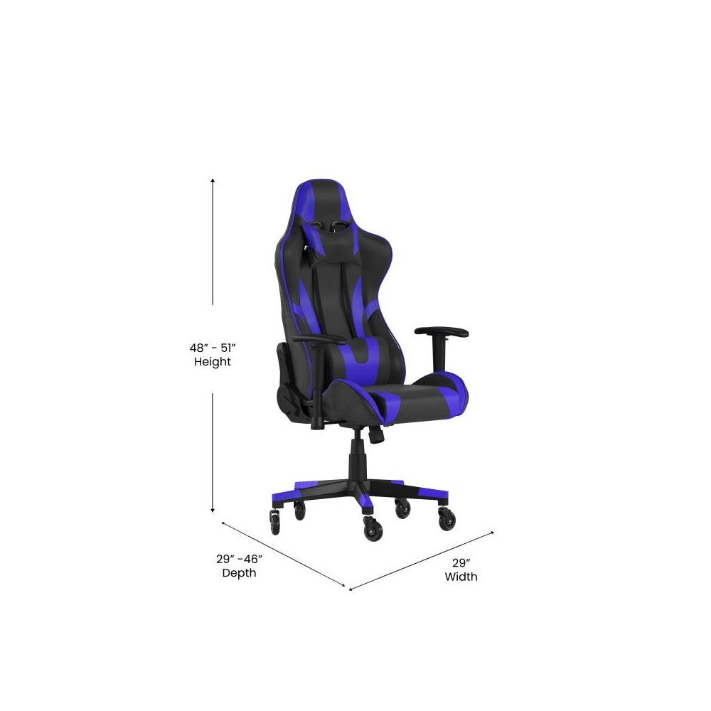 Moving from place to place just got easier with this gaming chair featuring a reclining back, transparent roller style wheels, and covered in soft and durable LeatherSoft upholstery. Support for your body is key when you will be sitting for extended periods and this PC office desk chair has you covered. Adjustable headrest and lumbar pillows can be repositioned where you need them or quickly unsnap them if you choose to remove them. Adjustable pivot arms relieve pressure from your neck and shoulders as well as the upper body. Gamers need ergonomic gaming chairs that'll keep them comfortable for many hours and this reclining office gaming chair with adjustable lumbar support will provide optimal support. Whether you need to lean back a little or a lot there's a separate lever to recline the back 87 degree ~ 145 degree while the lever underneath the seat controls the seat height and locks the chair in an upright position. The upgraded steel frame skate wheels boast ball-bearing smooth motion. If things get intense and you end up knocking over your drink or nachos, don't worry, This reclining chair cleans up easily with a solvent and water based cleaner such as foam. Complete your gaming experience with our red gaming ergonomic desk with cup holder and headphone hook or black gaming desk with cup holder, headphone hook, and monitor/smartphone stand. [CH-187230-1-BL-RLB-GG]