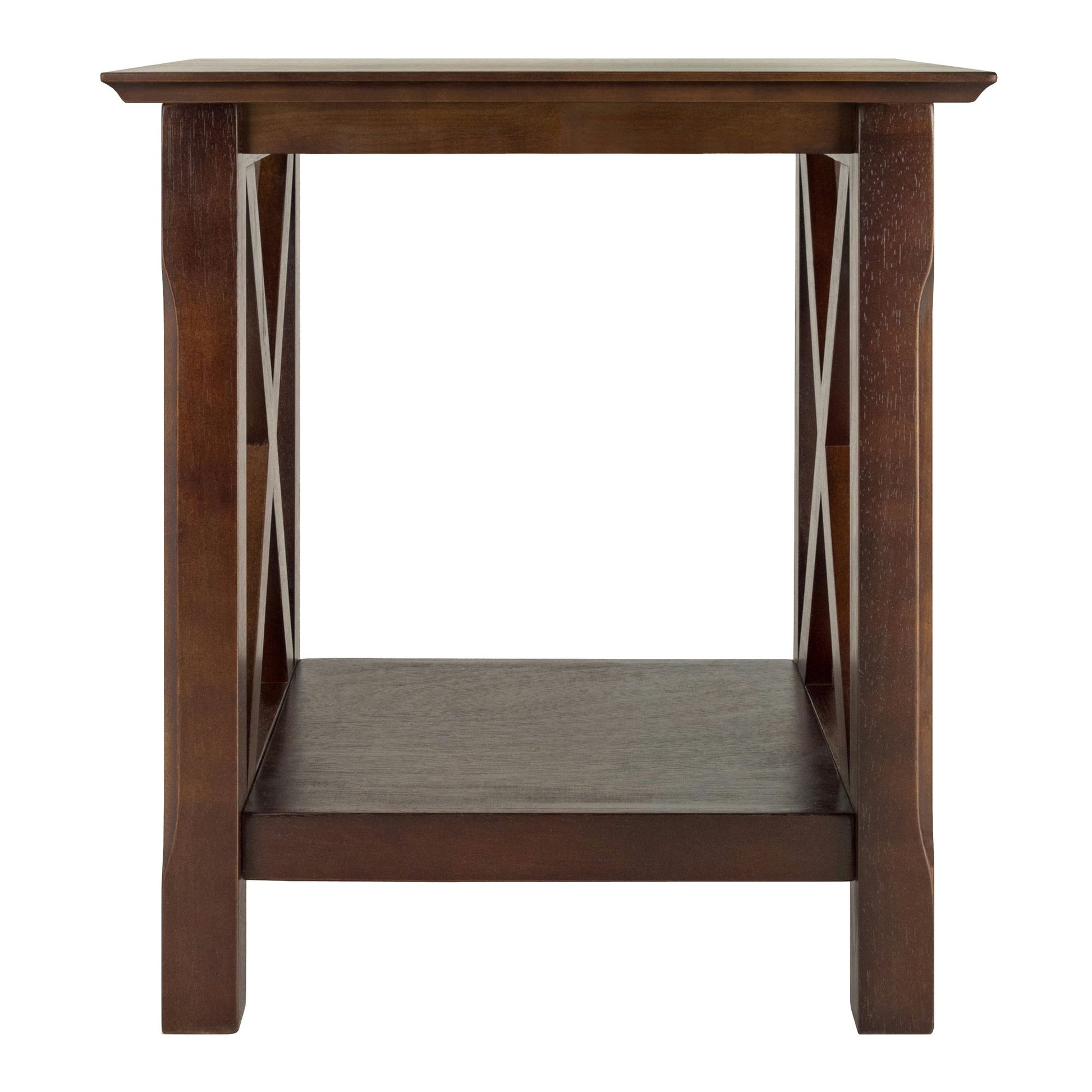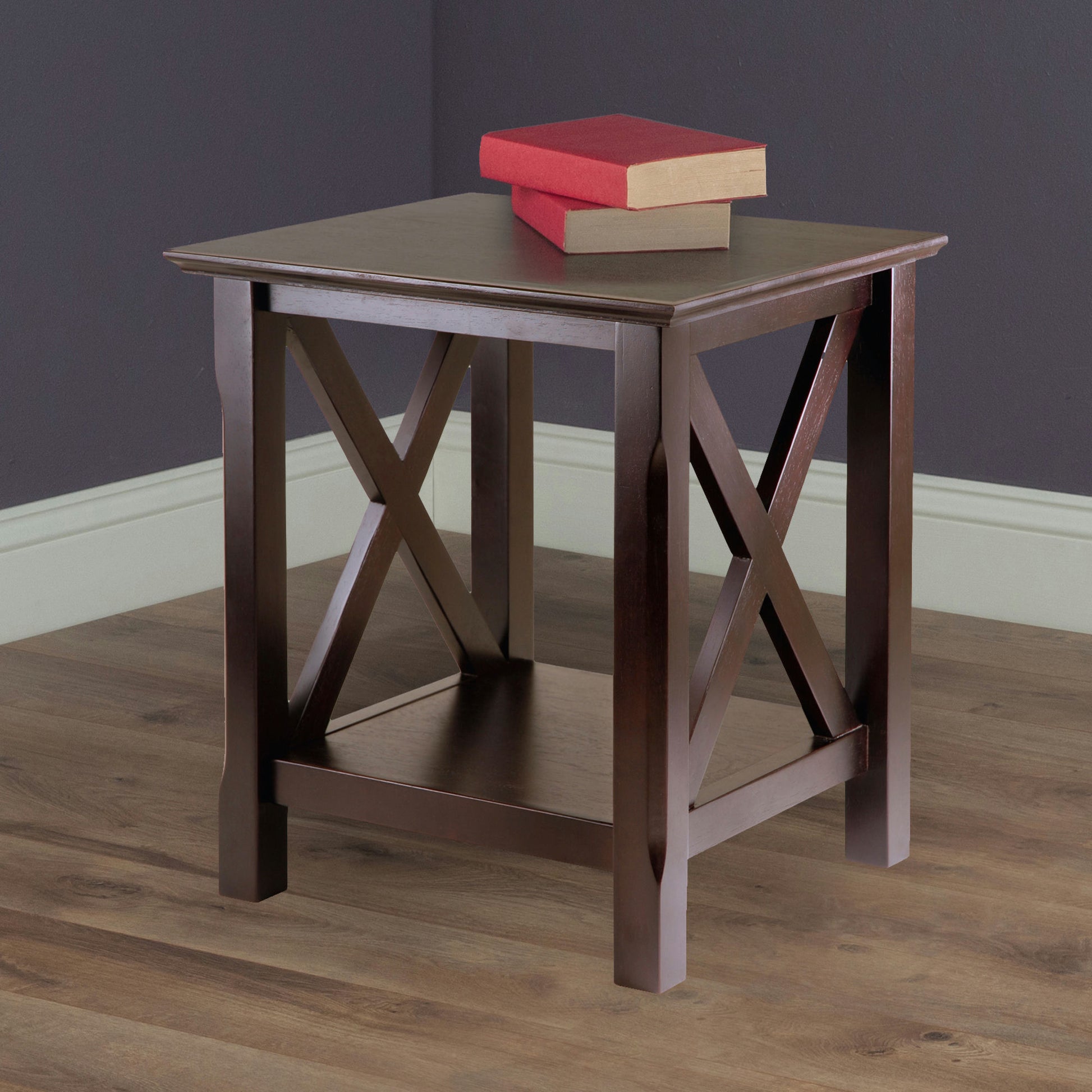 "X" style side panels, chamfered legs, and a smooth beveled tabletop put the Xola Accent Table at the top of the list for stylish and simple home decor. Made of solid and composite wood in a rich Capuccino finish, this end table with a lower shelf provides a great spot for books, magazine, or collectibles.