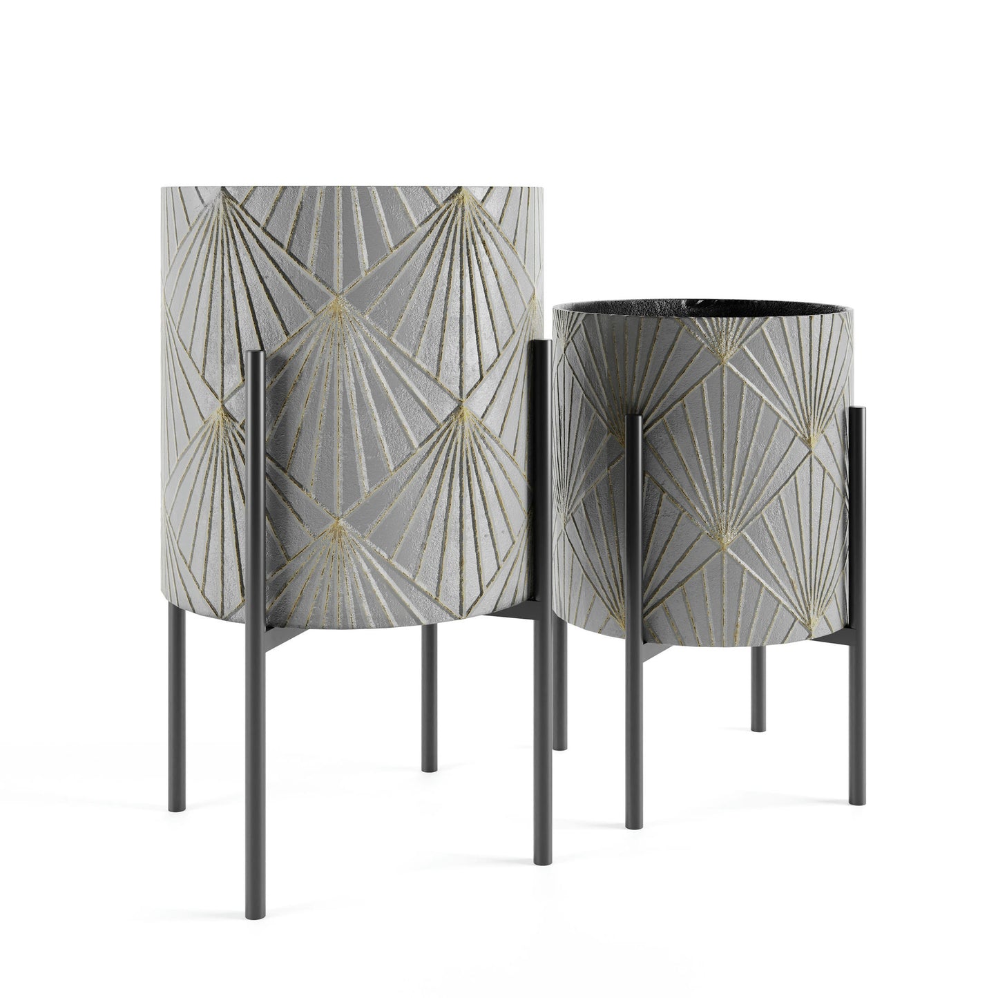 Show off your green thumb with these modern floor planters. Crafted from metal, these beauties feature a raised gold art deco inspired pattern and include the stands for an elevated look. Sold as a set of 2, these planters will add some glamour to your favorite house plants.